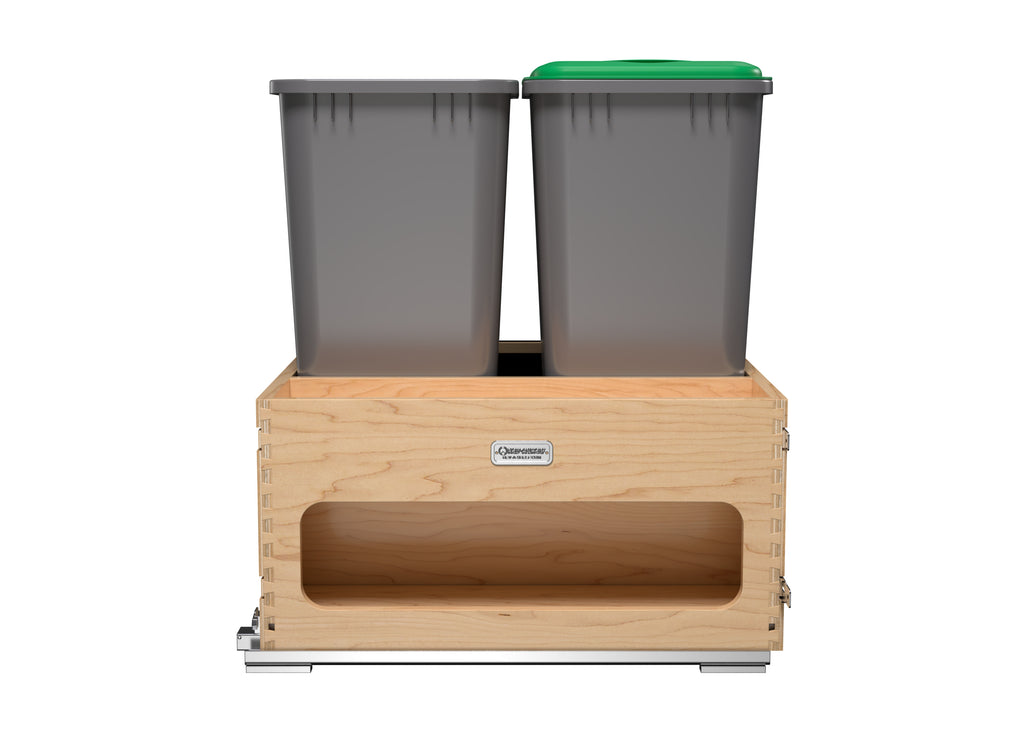 If you are looking for an all-in-one solution for your trash, recycling, and/or organic waste… your search is over! Rev-A-Shelf® is proud to introduce the 4WCWM Series Wood Bottom Mount Waste Management Center. Available with your choice of additional storage on the side or two 8 L containers (perfect for composting) held securely in place with a maple beauty ring, this pullout is a great addition to any kitchen. The maple dovetail frame glides on soft-close slides and boasts a reversible design with a side storage compartment.. Included: (1) Wood frame, (2) 50 qt. silver waste containers, (1) 50 qt. green lid, BLUM soft-close slides and mounting hardware