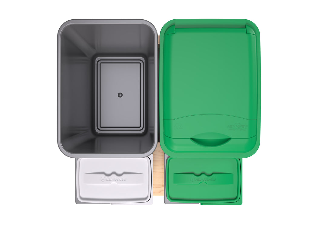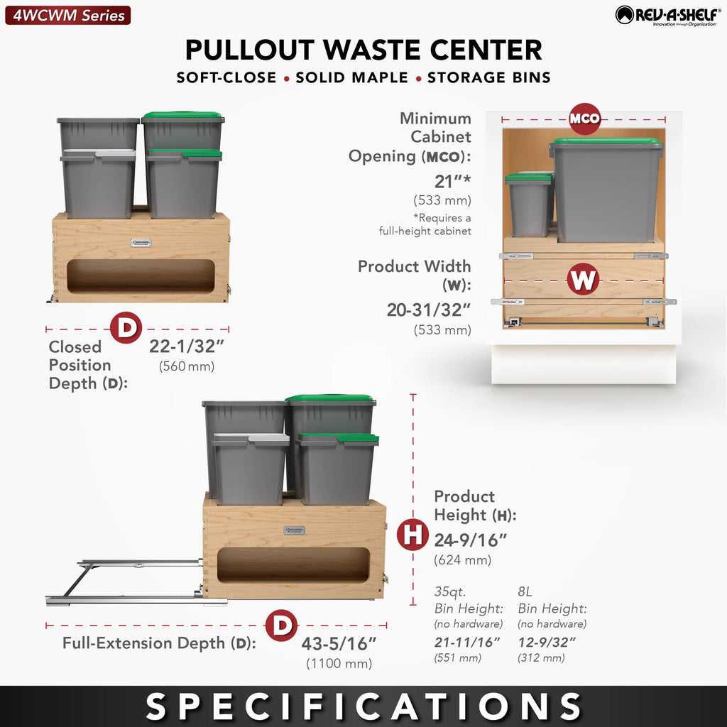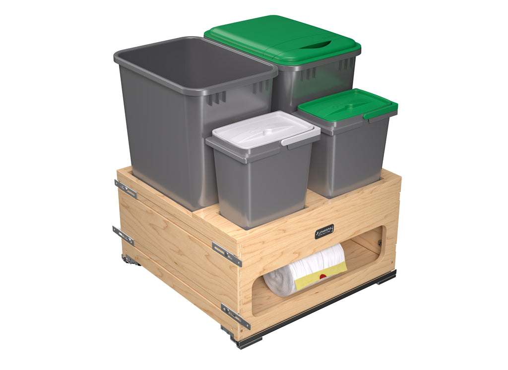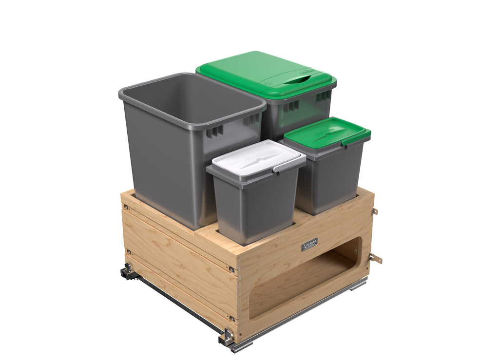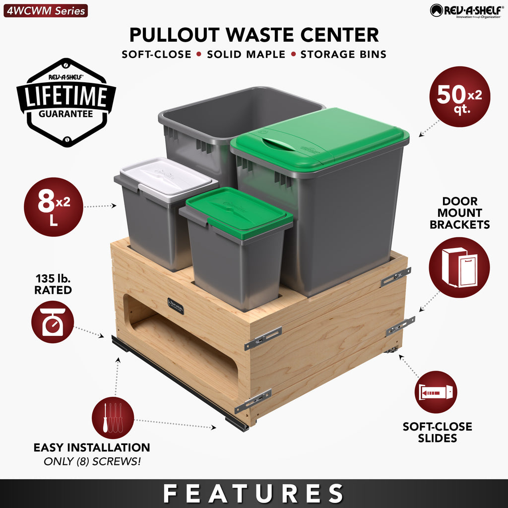 If you are looking for an all-in-one solution for your trash, recycling, and/or organic waste… your search is over! Rev-A-Shelf® is proud to introduce the 4WCWM Series Wood Bottom Mount Waste Management Center. Available with your choice of additional storage on the side or two 8 L containers (perfect for composting) held securely in place with a maple beauty ring, this pullout is a great addition to any kitchen. The maple dovetail frame glides on soft-close slides and boasts a reversible design with a side storage compartment.. Included: (1) Wood frame, (1) removable beauty ring for 8 L. bins, (2) 50 qt. sliver waste containers, (1) 50 qt. green lid, (2) 8 L. waste containers, (2) 8 L. lids, BLUM soft-close slides and mounting hardware