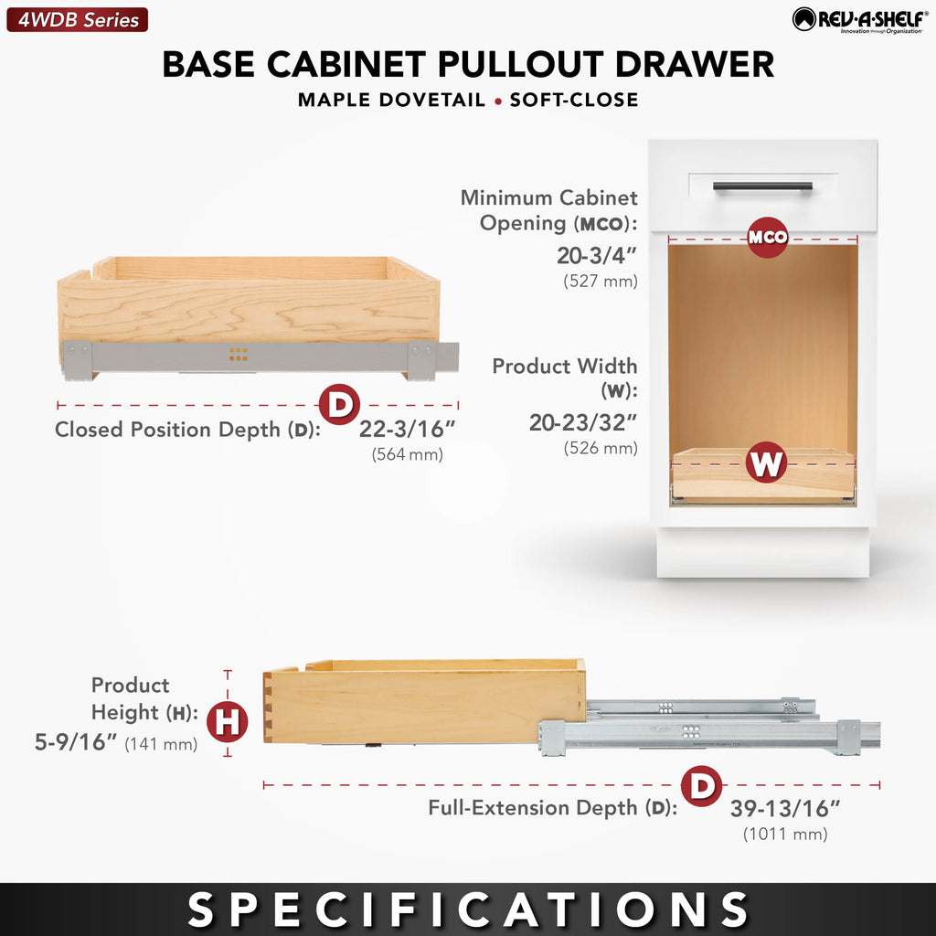 Add the perfect blend of storage and sophistication to your home with the 4WDB Series Wood Drawer Box from Rev-A-Shelf®. These pullout drawers offer plenty of storage, great for organizing and accessing a wide variety of items in the kitchen and pantry. The wood construction ensures durability and strength, while the BLUM soft-close slides add a luxurious touch.. Included: (1) Wood drawer, (1) pair of slides and mounting hardware