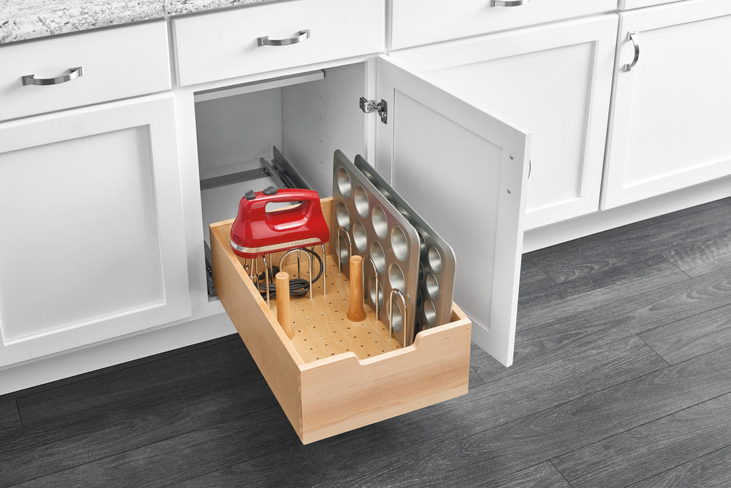 Add the perfect blend of storage and sophistication to your home with the 4WDB Series Wood Drawer Box from Rev-A-Shelf®. These pullout drawers offer plenty of storage, great for organizing and accessing a wide variety of items in the kitchen and pantry. The wood construction ensures durability and strength, while the BLUM soft-close slides add a luxurious touch.. Included: (1) Tall Wood drawer, wood pegs, metal dividers and mounting hardware