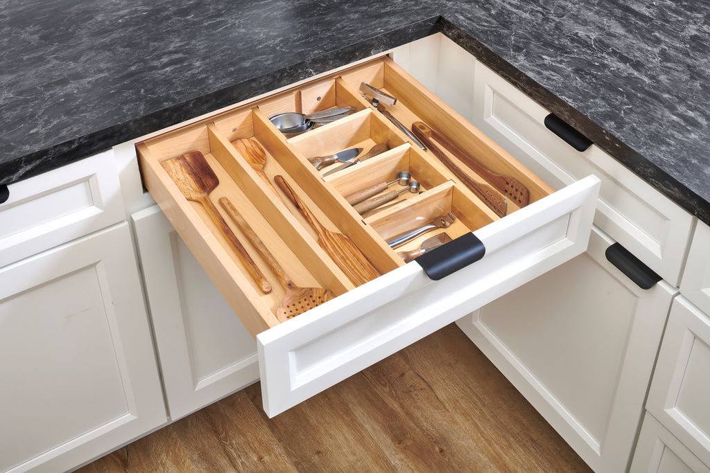 The 4WDIV Series Shallow Drawer Divider Insert from Rev-A-Shelf® is the perfect, versatile solution for kitchen drawers! With adjustable dividers, this system makes customizing your drawer into the perfect place to store your kitchen essentials easy. The 4WDIV Series installs in seconds with just four screws and comes with adjustable and removable dividers, allowing you to create multiple compartments in seconds for maximum organization.. Included: (2) drawer front and back rails, (1) long dividers, (2) long notched dividers, (3) small dividers amd mouting hardware