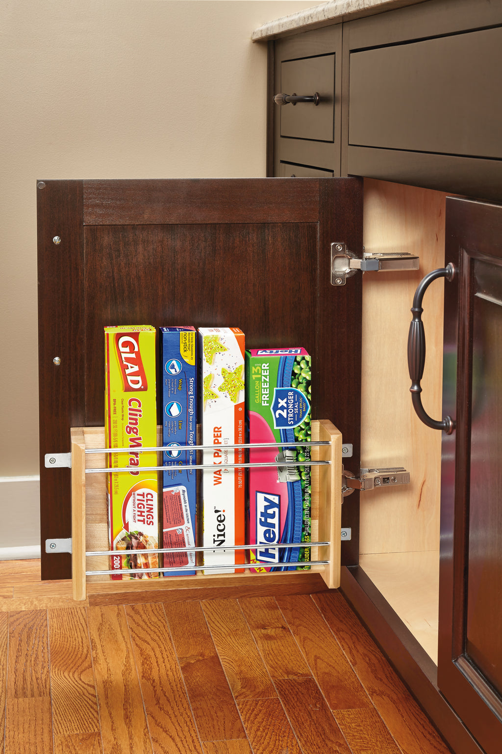 Designed for 15", 18" and 21" wall cabinets this beautiful wood organizer brings your foil and storage bags within easy reach while freeing up valuable drawer and pantry space. Made from Maple with chrome rails it is ideal for any decor. The patented adjustable mounting brackets ensure easy installation on various door styles.. Included: (1) Wood organizer with Chrome rails and mounting hardware