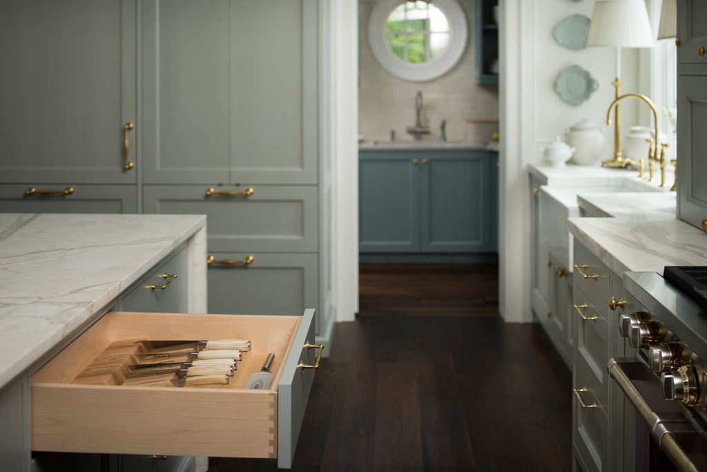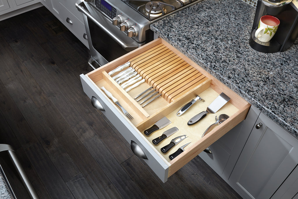 The unique Rev-A-Shelf® 4WKB-1 Knife Block Tray Insert is out of the box ready at 18-1/2" x 22" providing (19) slots to store knives and has a separate compartment for other utensils. The unique design provides more storage then a traditional knife block and with its simple drop-in installation valuable counter top space is available to use immediately. Made of our classic hardwood with a UV-cured clear finish to ensure an acceptable match to any kitchen cabinet and can be trimmed-to-fit drawers of various widths and lengths.. Included: (1) Wood knife block insert