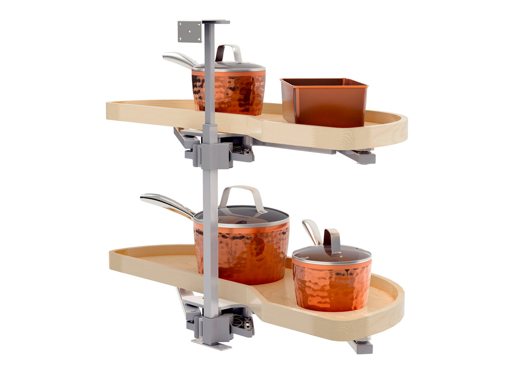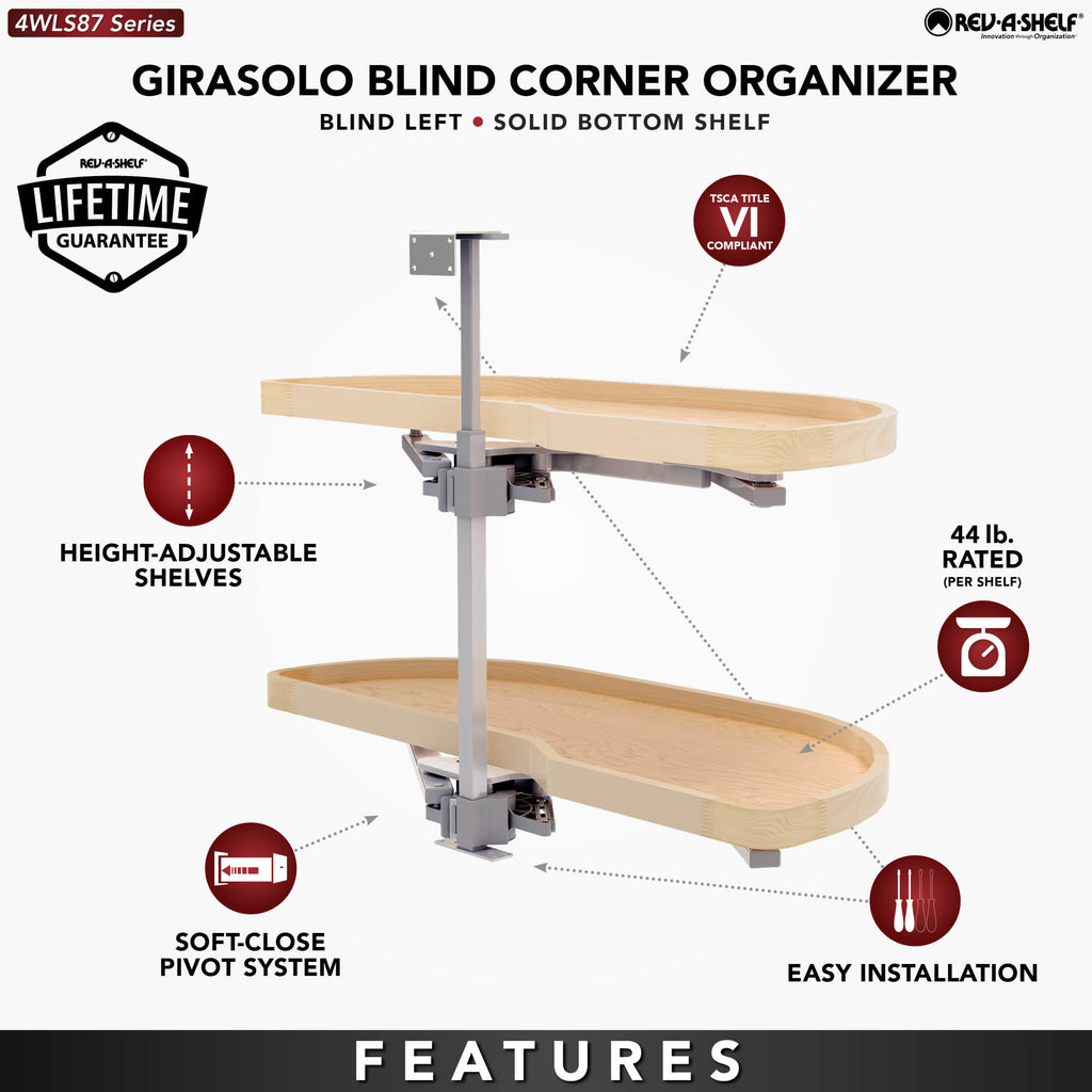 The 4WLS87 Series “Girasolo” Blind Corner Optimizer by Rev-A-Shelf® transforms underutilized blind corners into smart, accessible storage. Built on a soft-close pivot system, its tray effortlessly glides out of the cabinet and toward you, making hard-to-reach items a thing of the past. With sturdy metal hardware, premium maple shelves with finger joint rims and flexible mounting options, the Girasolo is designed to fit a variety of cabinet sizes and configurations. Included: (2) Right Girasolo Wood Classic trays, post mechanism and mounting hardware