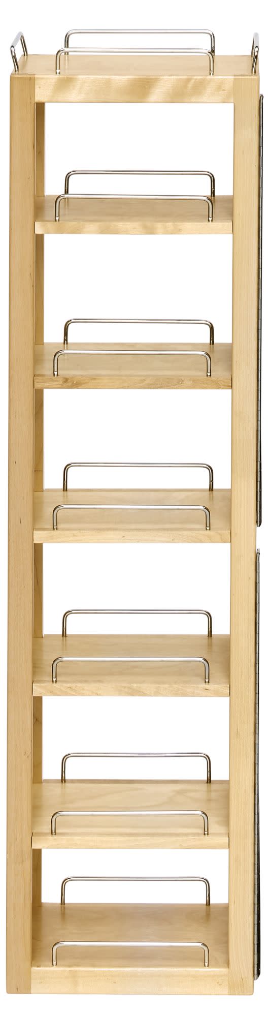 The 4WP Series swing-out wood pantry is designed for pantry cabinets. The series features amenities the competitors just don't offer from an industrial piano hinge, adjustable pantry shelves with chrome rails, to the customization flexibility of being able to add or remove stylish chrome bars to the top of the units for additional shelf space swing-out pantry. The solid construction consists of 1/2" maple wood that has a UV-cured, clear finish to ensure a beautiful match to any cabinet.. Included: (1) Wood swing out pantry with (6) adjustable shelves and mounting hardware