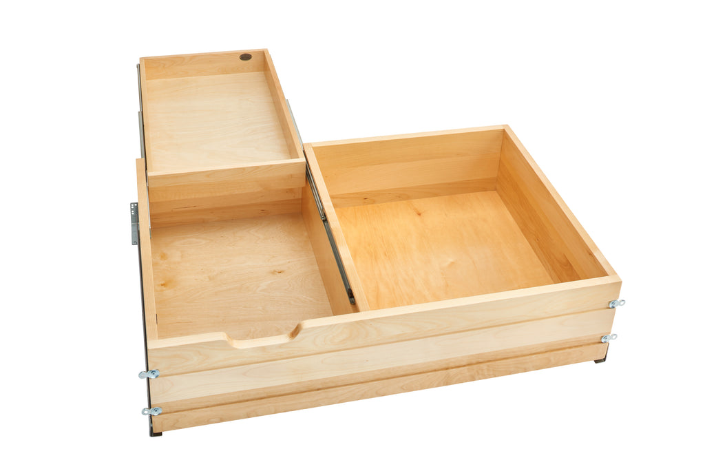 Double up your drawer space with the Rev-A-Shelf® deep Two-Tiered drawer systems. This drawer box comes pre-assembled and ready to install into your existing cabinet drawer opening. Simply remove your current drawer and install. The deeper storage is perfect for larger items like taller pots and pans or mixing bowls. Available in a faceframe or frameless design depending on your cabinet style. Options exist to have slides included or you can supply your own.. Included: (1) Wood Two-Tier drawer system, Slides and mounting hardware