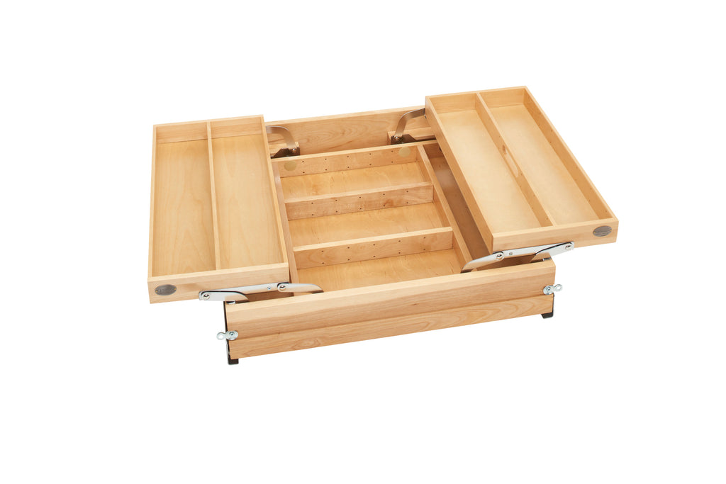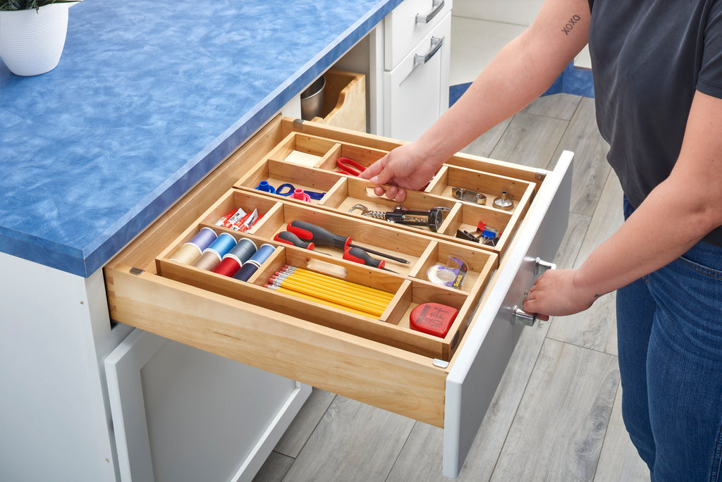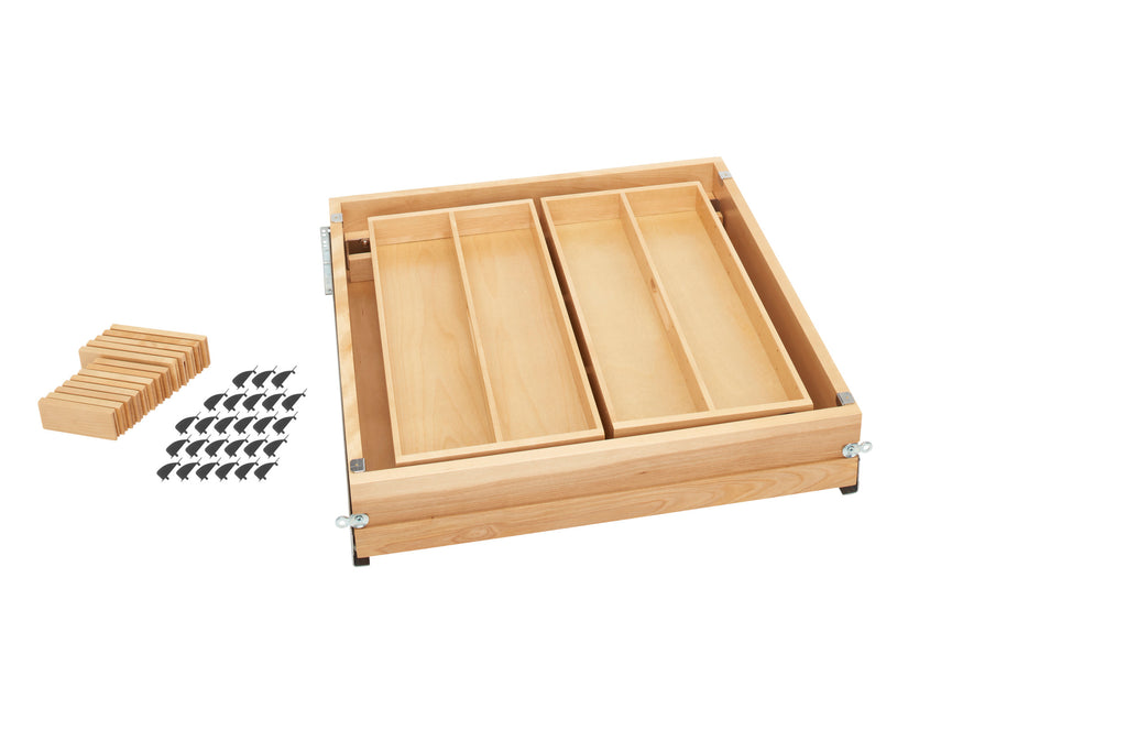 Drawers flowing over and desperately need organization? Then look no further than the Maxx Drawer System. This one-of-a-kind drawer system, developed in collaboration with Cabinetworks Group, maximizes the available space within the drawer.. Included: (1) Wood Two-Tier drawer system, Slides and mounting hardware