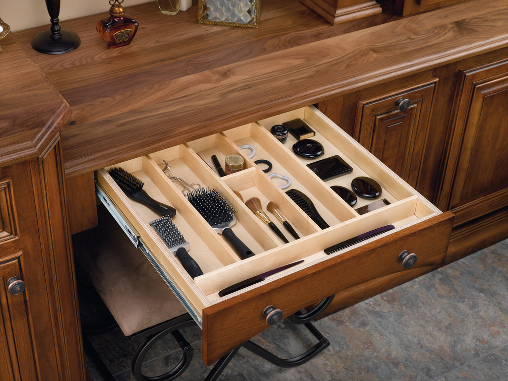 Organize kitchen drawers with the Rev-A-Shelf® Wood Utensil Tray Insert. The 4WUT Series is made of either our classic maple hardwood with a UV-cured clear finish or our walnut construction with satin finish to ensure an acceptable match to any kitchen cabinet. This modern day clutter solution requires a simple drop-in installation with various sizes that may be trimmed-to-fit your drawer size.. Included: (1) drawer insert