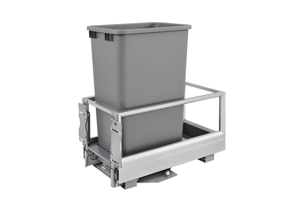 Looking for a sturdy, attractive pullout waste container that is perfect for any kitchen? Look no further than this American made product. This fully assembled aluminum construction frame will not only close softly, but it will also assist you when opening your unit with its patented slide and dampener system. All of the 5149 series also include a 4-way adjustable door mount bracket that will finish off your installation by attaching your own cabinet door for easy operation. Available in various colors, widths and heights.. Included: (1) Silver 50 qt. waste container, (1) metal frame, (1) pair of slides, mounting hardware, and Door-Mount brackets