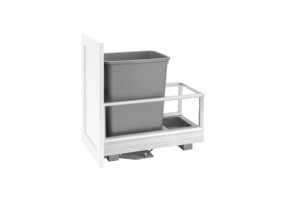 Looking for a sturdy, attractive pullout waste container that is perfect for any kitchen? Look no further than this American made product. This fully assembled aluminum construction frame will not only close softly, but it will also assist you when opening your unit with its patented slide and dampener system. All of the 5149 series also include a 4-way adjustable door mount bracket that will finish off your installation by attaching your own cabinet door for easy operation. Available in various colors, widths and heights.. Included: (1) Silver 35 qt. waste container, (1) metal frame, (1) pair of slides, mounting hardware, and Door-Mount brackets