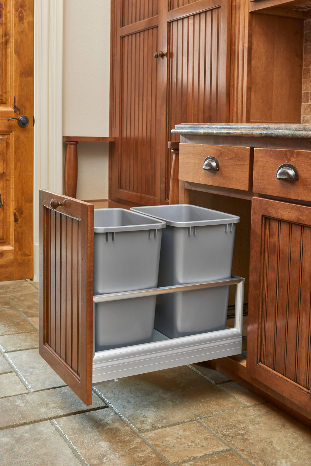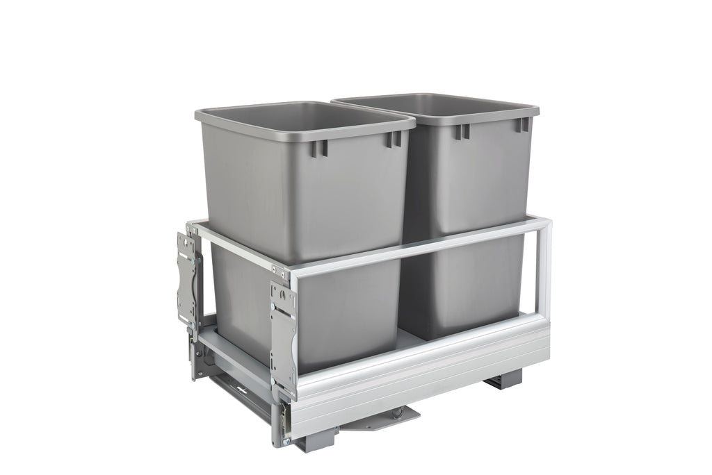 Looking for a sturdy, attractive pullout waste container that is perfect for any kitchen? Look no further than this American made product. This fully assembled aluminum construction frame will not only close softly, but it will also assist you when opening your unit with its patented slide and dampener system. All of the 5149 series also include a 4-way adjustable door mount bracket that will finish off your installation by attaching your own cabinet door for easy operation. Available in various colors, widths and heights.. Included: (2) Silver 35 qt. waste containers, (1) metal frame, (1) pair of slides, mounting hardware, and Door-Mount brackets