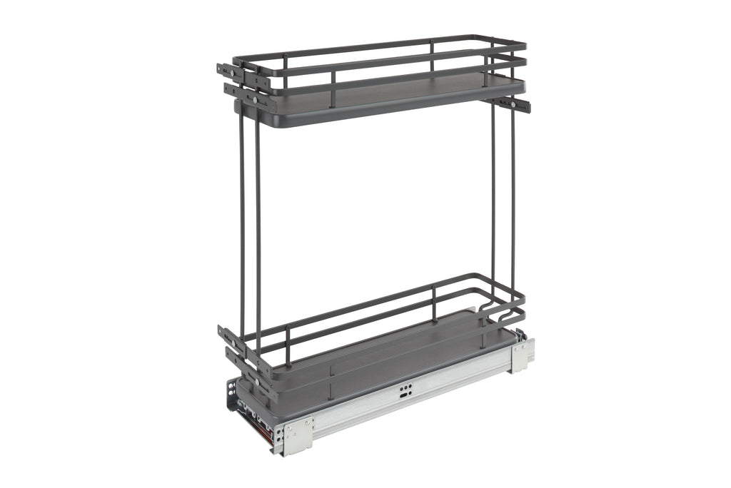Bring the elegance with this chic design into your home with the Rev-A-Shelf® 5322 Series designed for frameless (full-access) and face frame cabinets. This Two-Tier Base Organizer combines clean lines, modern flat wire accents, and beautiful Orion Gray finish creates a striking piece of organizational technology. Features patented door-mount brackets, BLUM soft-close slides system and heavy-duty construction.. Included: (1) Two-Tier Organizer, (1) pair of Slides and mounting hardware