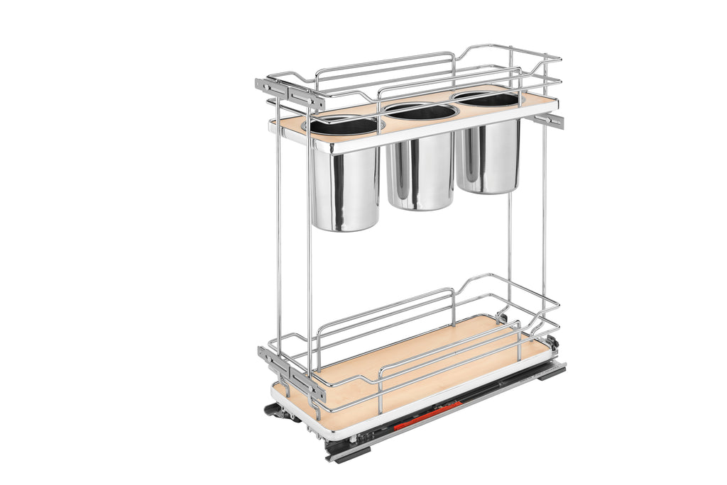 Bring the elegance with this chic design into your home with the Rev-A-Shelf® 5322 Series designed for faceframe and frameless (full-access) cabinets. This Two-Tier Base Organizer combines clean lines, modern accents, and your choice of luxurious grey or maple shelving surfaces to create a striking piece of organizational technology. Features patented door-mount brackets, BLUM soft-close slides system and heavy-duty construction.. Included: (1) Two-Tier Organizer, (1) pair of Slides, (3) Chrome bins, mounting hardware