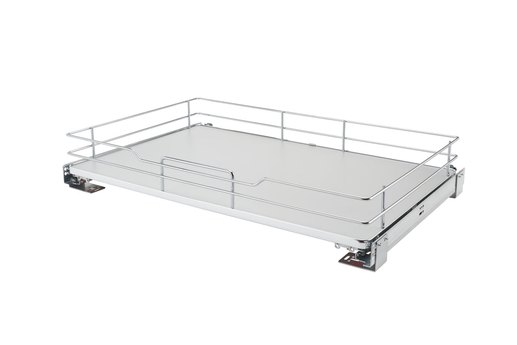 The Rev-A-Shelf® 5330 Pullout Shelves Series feature beautiful solid bottoms to match every kitchen style. The pullout shelves are designed for 15", 18", 24", and 36" cabinet and can be side or bottom mounted. Units glide on BLUM full-extension, soft-close slides and can also be individually door-mounted with included brackets. No single pullout shelf is more elegant than this Italian design and you will understand once installed.. Included: (1) Gray Basket, Slides, Door-Mount kit, Hardware