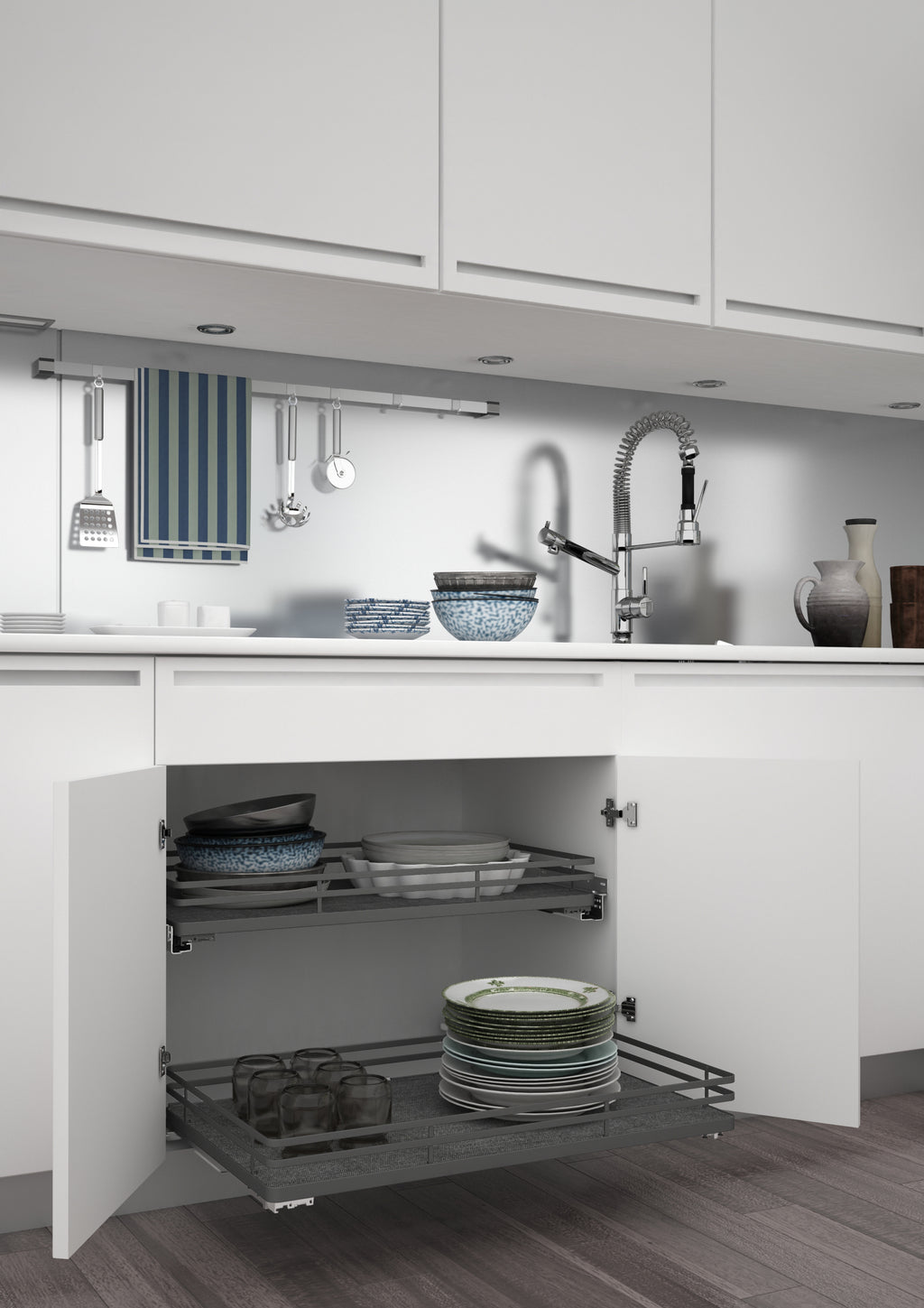 - Use multiple baskets in taller cabinets to create a well organized pantry