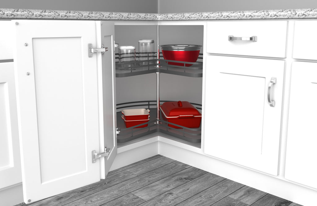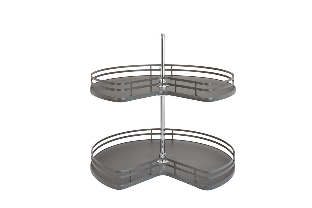 Make the most of that tricky corner cabinet space with the Rev-A-Shelf® 53472 Series Solid Bottom Two-Tier Kidney-Shaped Lazy Susan. Available in two sizes, these two-tier Lazy Susans include a telescoping shaft with independently rotating hardware for a perfect fit and easy access to your angled corner cabinet. Choose from multiple stylish finishes!. Included: (2) 32" Solid Bottom Kidney Susan Shelf, (1) telescoping post and mounting hardware