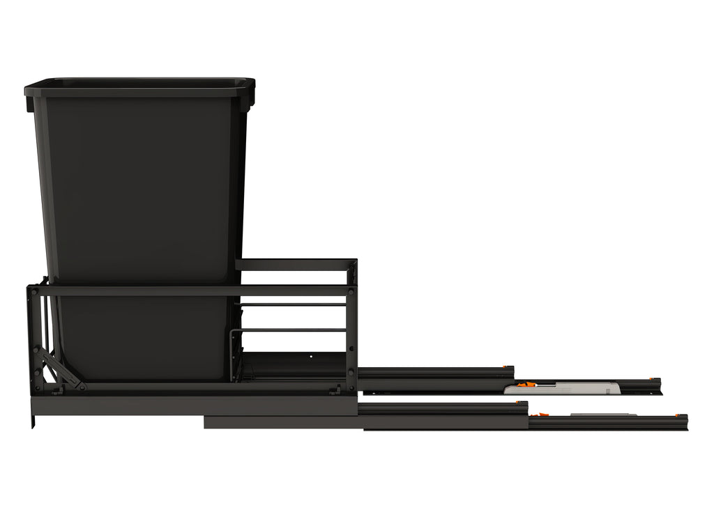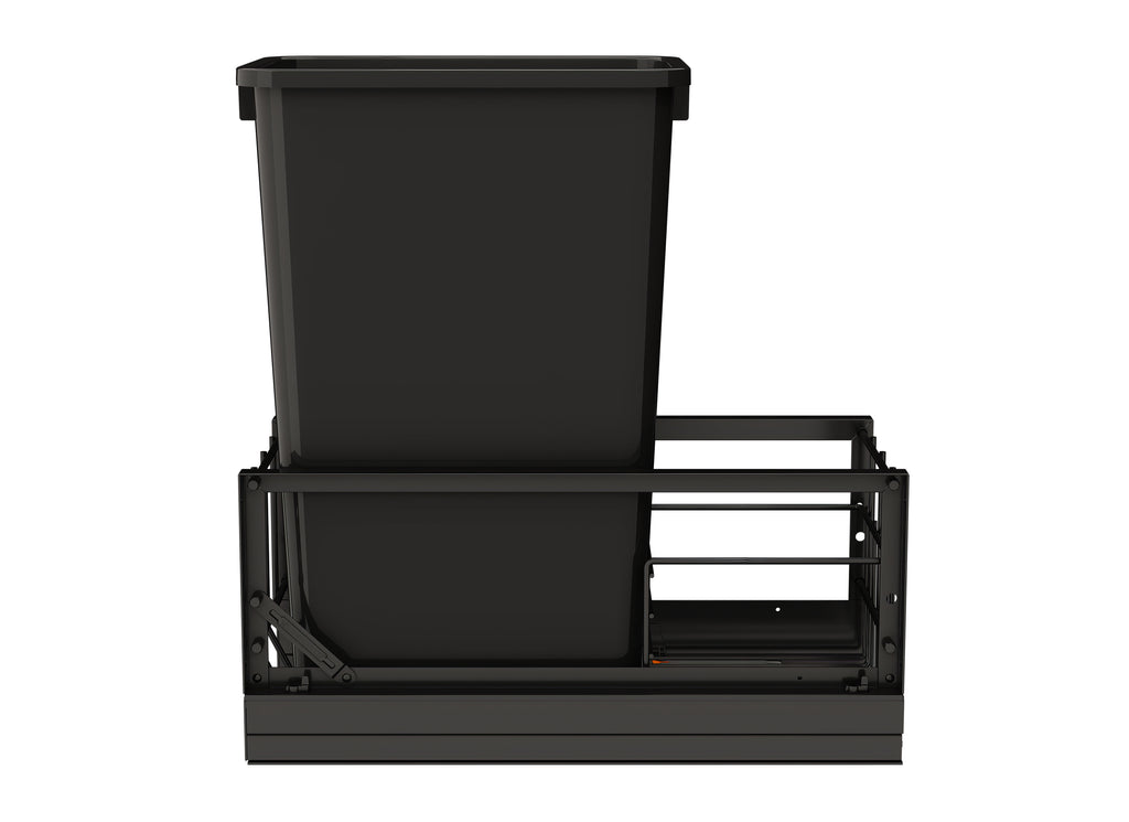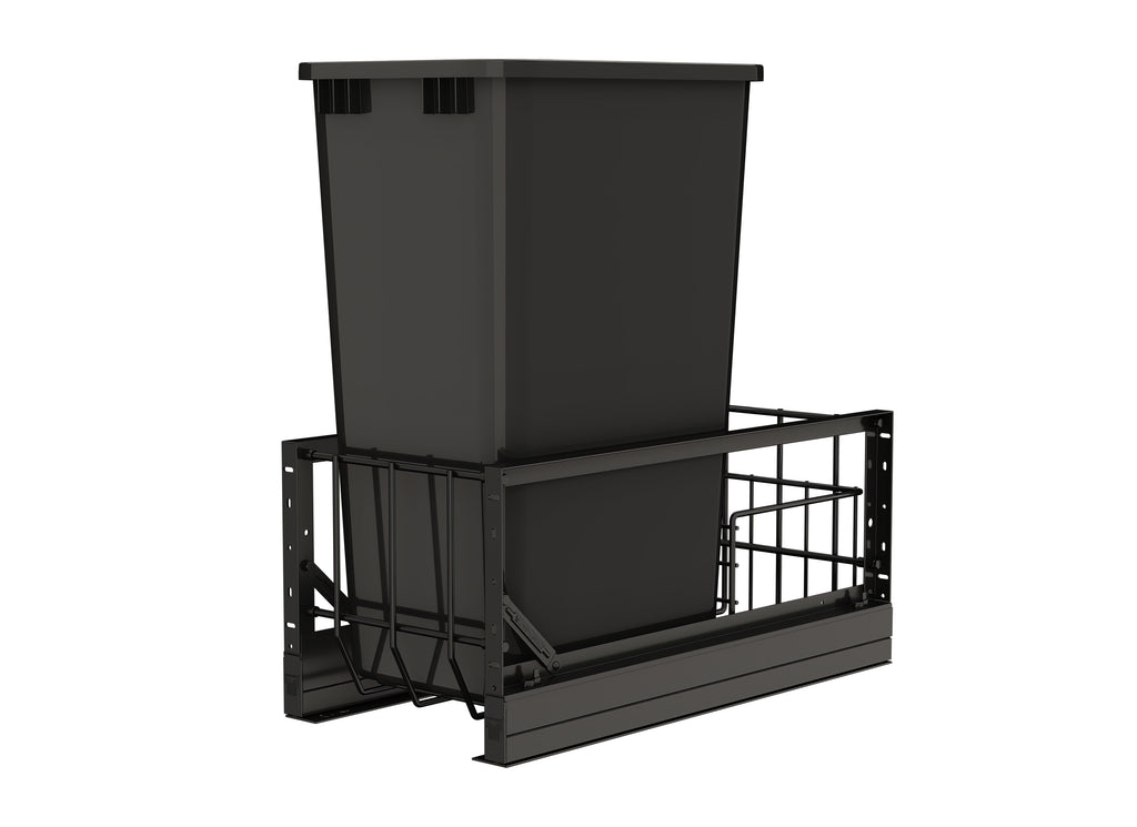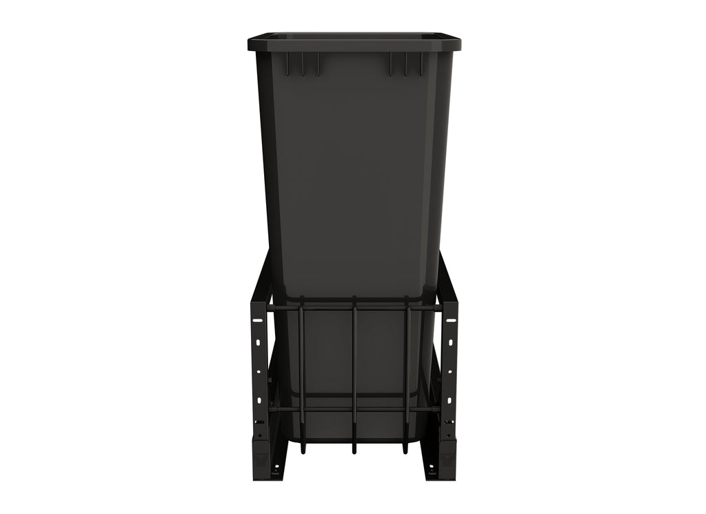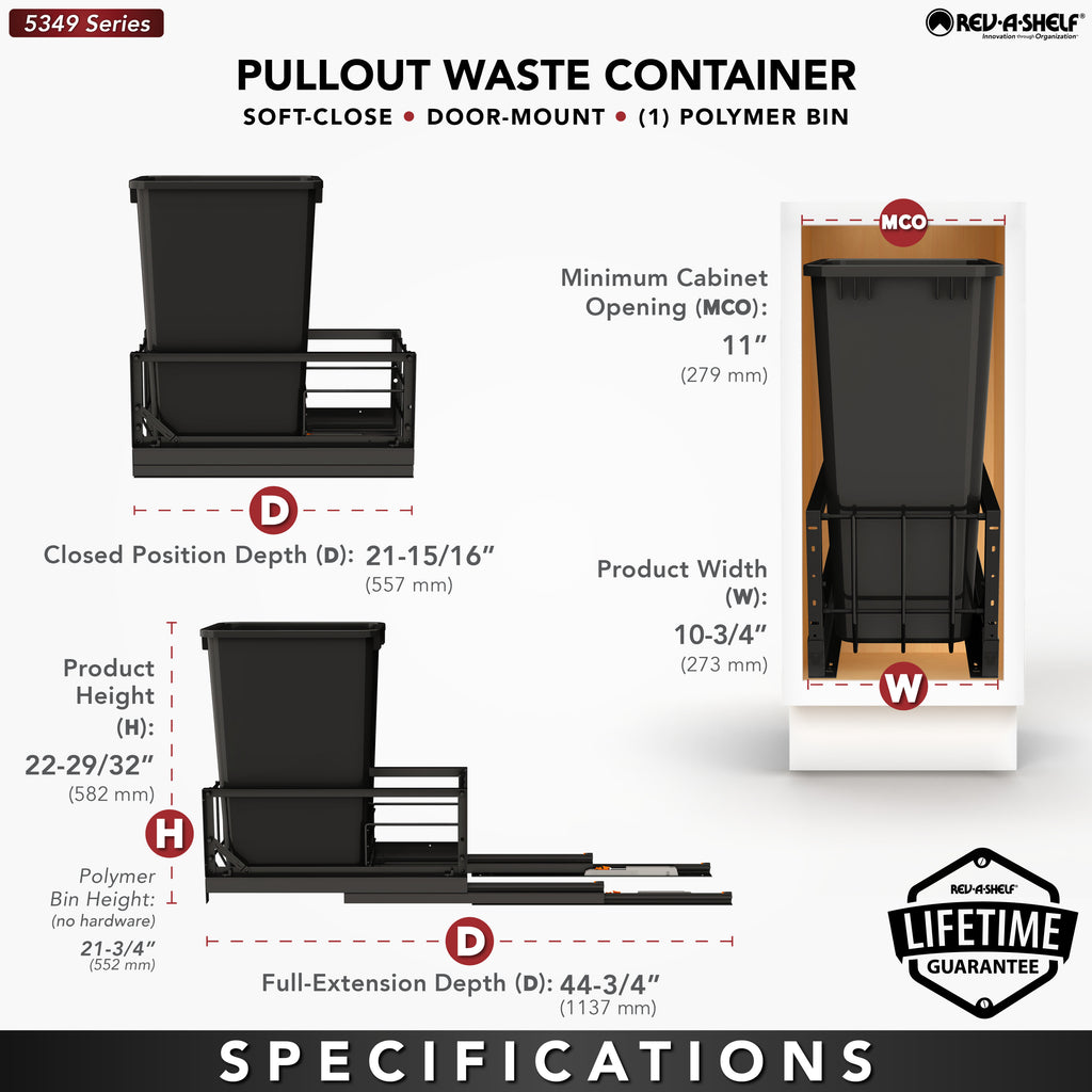 The 5349 Series from Rev-A-Shelf® sets a new standard for premium design and functionality. Featuring Italian-inspired elegance, these units offer a heavy-duty aluminum frame and smooth, soft-closing slides for effortless operation. The included door-mount hardware allows you to seamlessly attach your cabinet door, creating a sleek, cohesive look that integrates beautifully into your cabinetry.. Included: (1) Black 50 qt. waste container, (1) metal frame, (1) pair of soft-close slides and mounting hardware