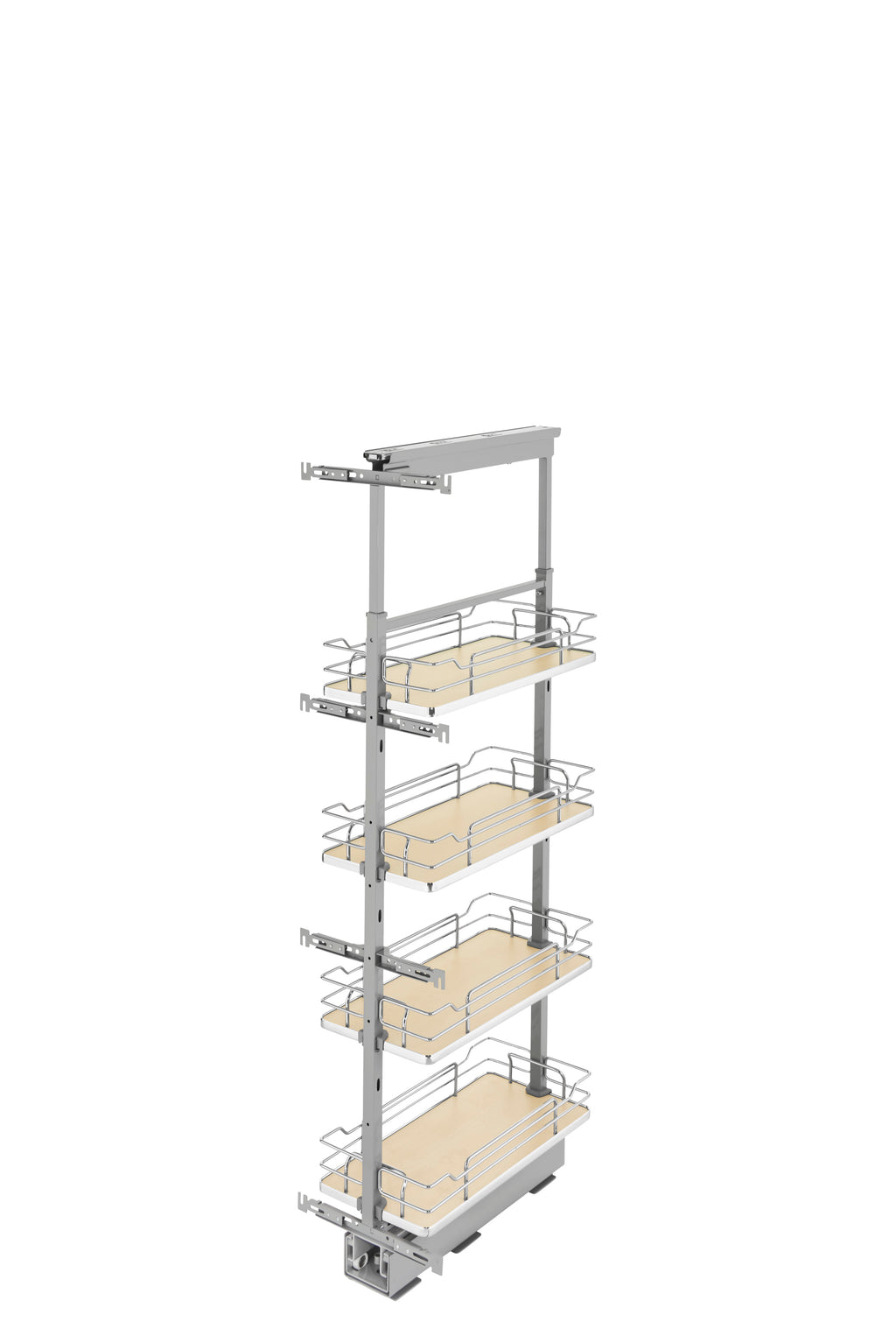 Rev-A-Shelf® 5300 Pullout Pantry Series is the answer to your full access (frameless) cabinetry needs. The series now offers increased basket depths for 24" deep cabinetry and comes in five different widths and four height ranges. Available in a beautiful maple or contemporary gray solid bottom to match every kitchen style, the 5300 Series glides quietly on 250 lb. rated full-extension, soft-close slide system. Features micro-adjustable door-mounting and all kits are packaged with frame, baskets and hardware.. Included: (4) Maple Solid bottom baskets, (1) Frame, (1) 200 lb. slide system, (2) Door-Mount brackets, hardware