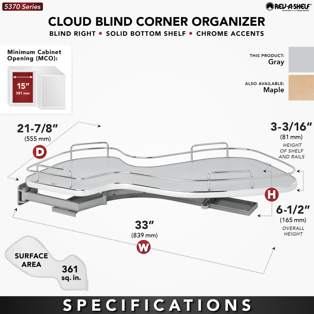Reach for the stars and fulfill your storage needs with the Cloud Contemporary Blind Corner Organizer. Designed for blind corner cabinets with 15", 18", or 21" cabinet opening, the Cloud is available in multiple colors (Maple, Gray and Orion Gray) to match any kitchen, while adding a pinch of style in the process . Available in both single and two-tier, in either left or right hand options, the Cloud fits into nearly all blind corner applications and is available with or without soft-close.. Included: (1) Cloud Shelf, Hardware