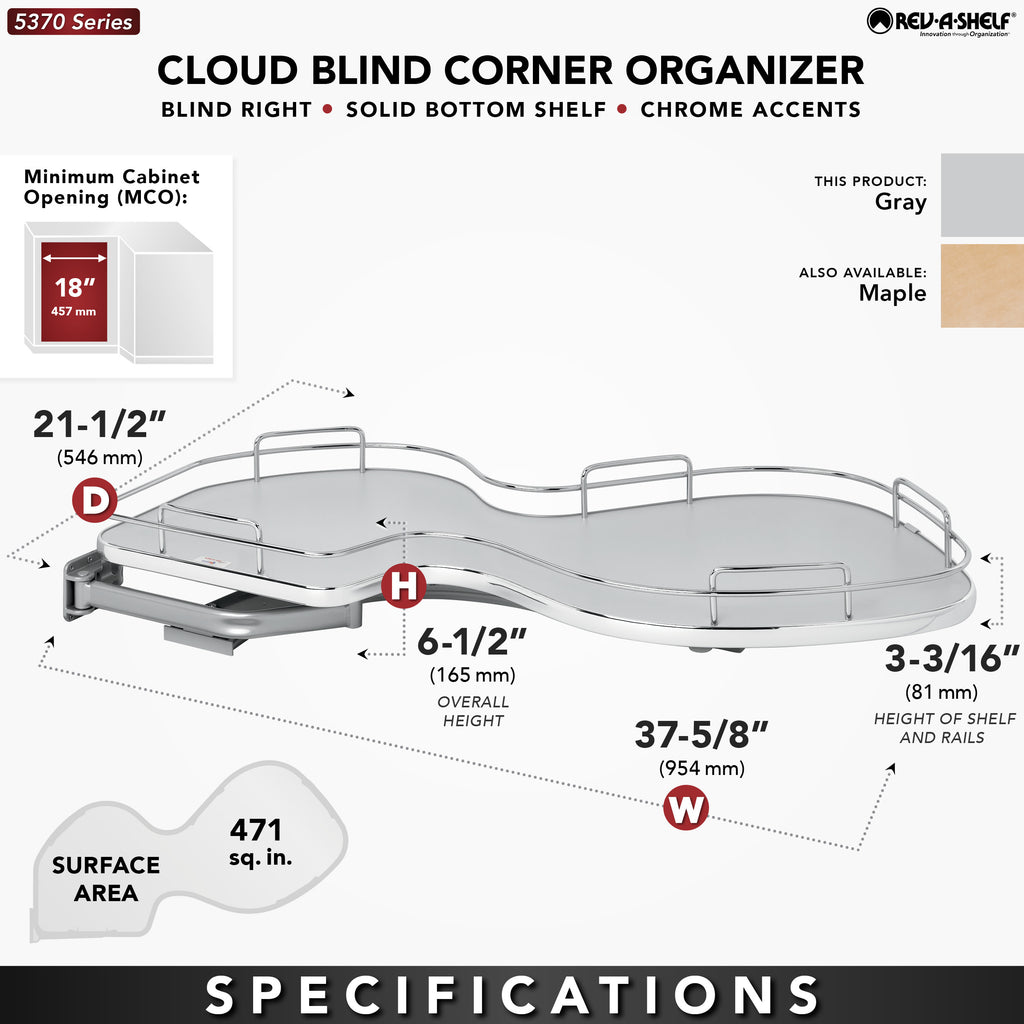 Reach for the stars and fulfill your storage needs with the Cloud Contemporary Blind Corner Organizer. Designed for blind corner cabinets with 15", 18", or 21" cabinet opening, the Cloud is available in multiple colors (Maple, Gray and Orion Gray) to match any kitchen, while adding a pinch of style in the process . Available in both single and two-tier, in either left or right hand options, the Cloud fits into nearly all blind corner applications and is available with or without soft-close.. Included: (1) Cloud Shelf, Hardware