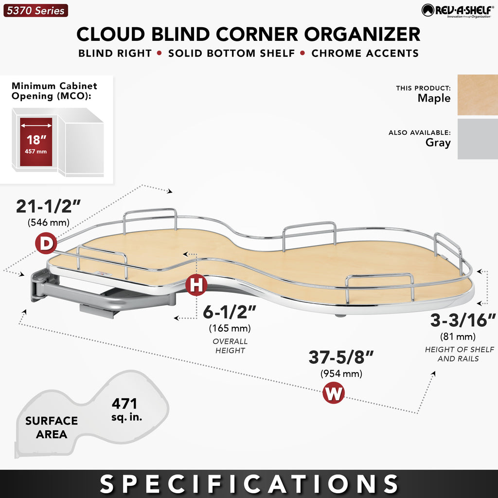 Reach for the stars and fulfill your storage needs with the Cloud Contemporary Blind Corner Organizer. Designed for blind corner cabinets with 15", 18", or 21" cabinet opening, the Cloud is available in multiple colors (Maple, Gray and Orion Gray) to match any kitchen, while adding a pinch of style in the process . Available in both single and two-tier, in either left or right hand options, the Cloud fits into nearly all blind corner applications and is available with or without soft-close.. Included: (1) Cloud Shelf, Hardware