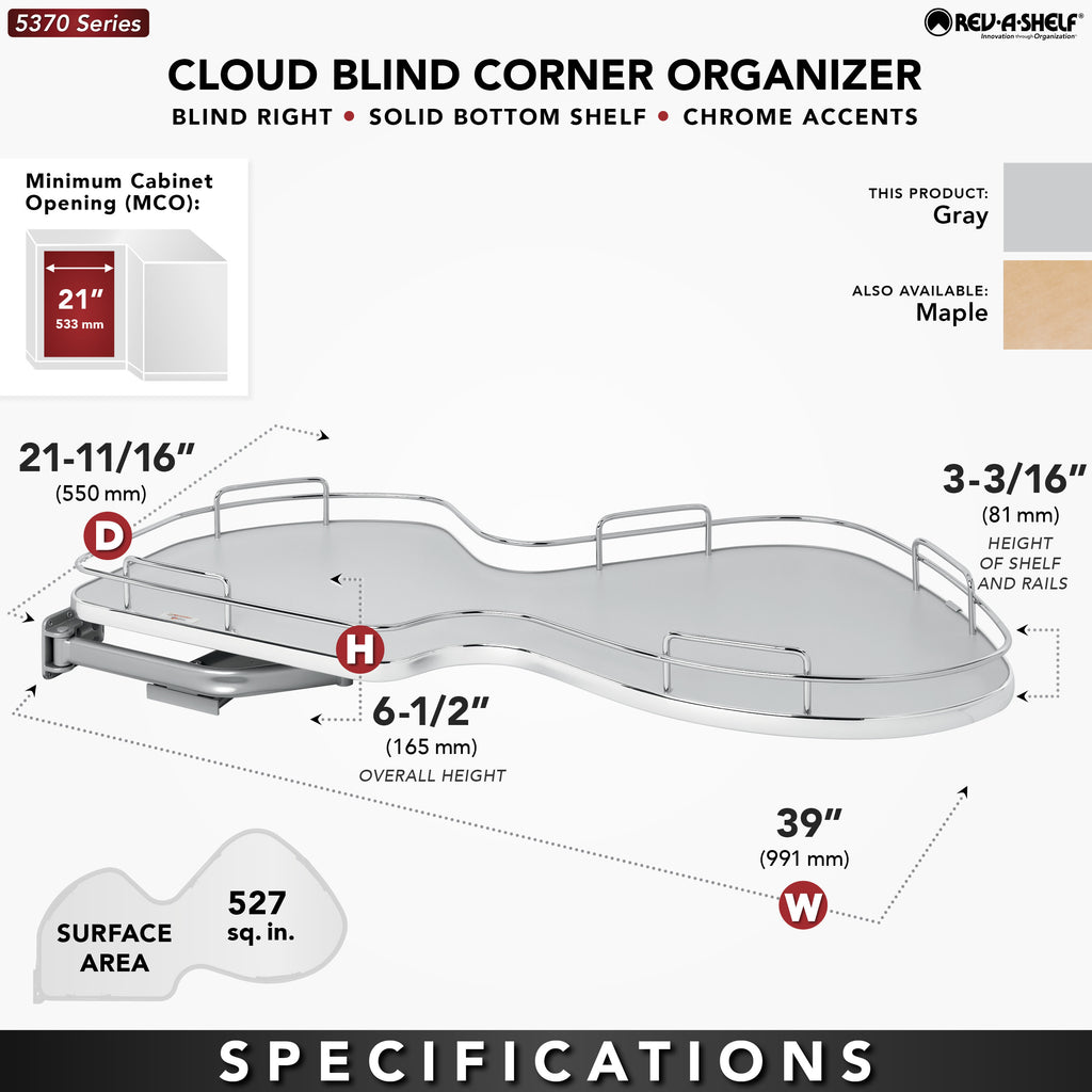Reach for the stars and fulfill your storage needs with the Cloud Contemporary Blind Corner Organizer. Designed for blind corner cabinets with 15", 18", or 21" cabinet opening, the Cloud is available in multiple colors (Maple, Gray and Orion Gray) to match any kitchen, while adding a pinch of style in the process . Available in both single and two-tier, in either left or right hand options, the Cloud fits into nearly all blind corner applications and is available with or without soft-close.. Included: (1) Cloud Shelf, Hardware