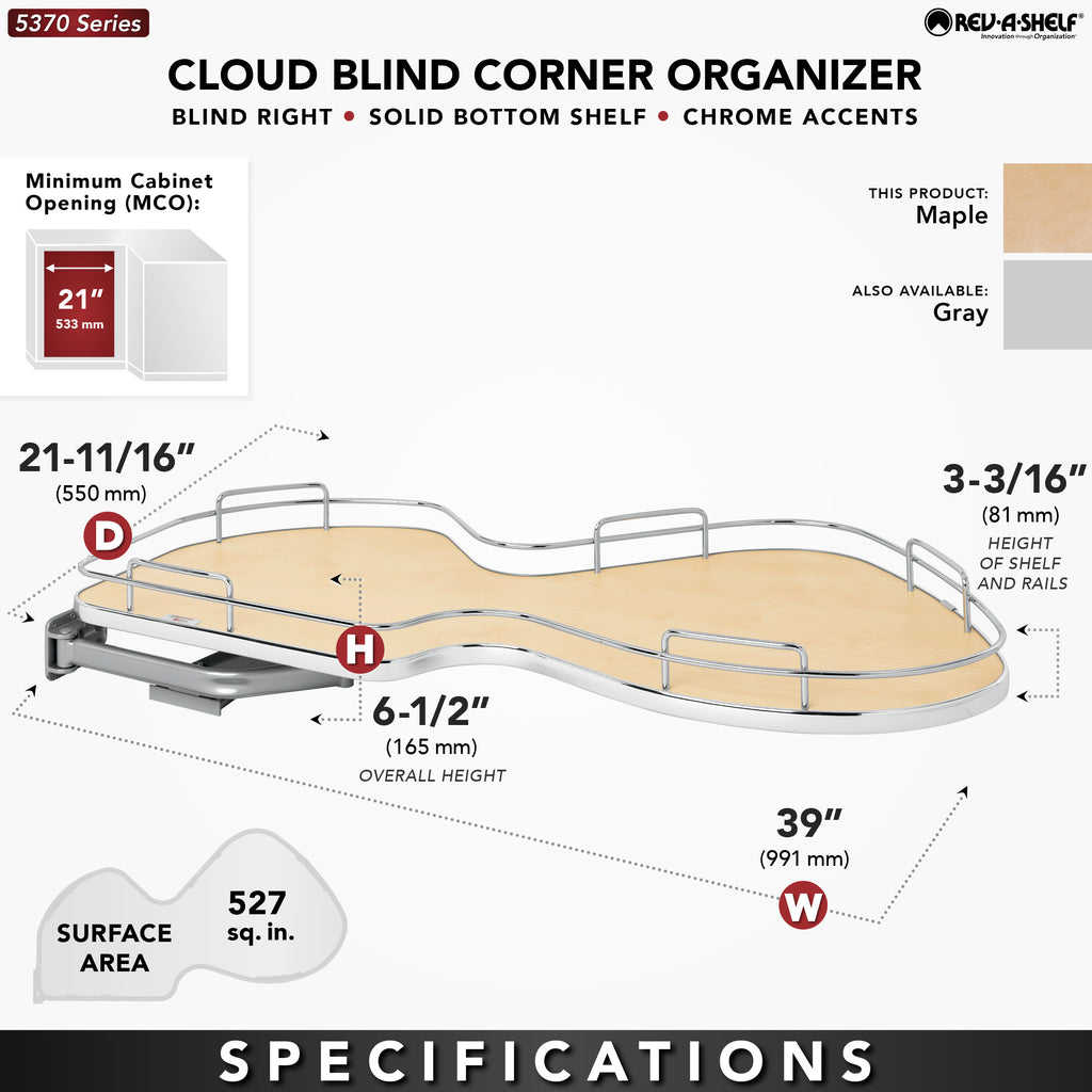 Reach for the stars and fulfill your storage needs with the Cloud Contemporary Blind Corner Organizer. Designed for blind corner cabinets with 15", 18", or 21" cabinet opening, the Cloud is available in multiple colors (Maple, Gray and Orion Gray) to match any kitchen, while adding a pinch of style in the process . Available in both single and two-tier, in either left or right hand options, the Cloud fits into nearly all blind corner applications and is available with or without soft-close.. Included: (1) Cloud Shelf, Hardware