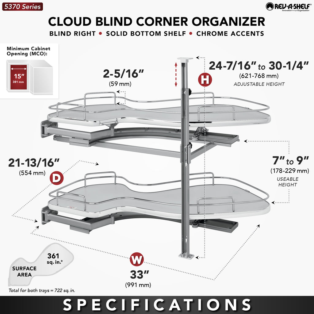 Reach for the stars and fulfill your storage needs with the Cloud Contemporary Blind Corner Organizer. Designed for blind corner cabinets with 15", 18", or 21" cabinet opening, the Cloud is available in multiple colors (Maple, Gray and Orion Gray) to match any kitchen, while adding a pinch of style in the process . Available in both single and two-tier, in either left or right hand options, the Cloud fits into nearly all blind corner applications and is available with or without soft-close.. Included: (2) Cloud Shelves, glide assembly, telescoping mounting post, hardware