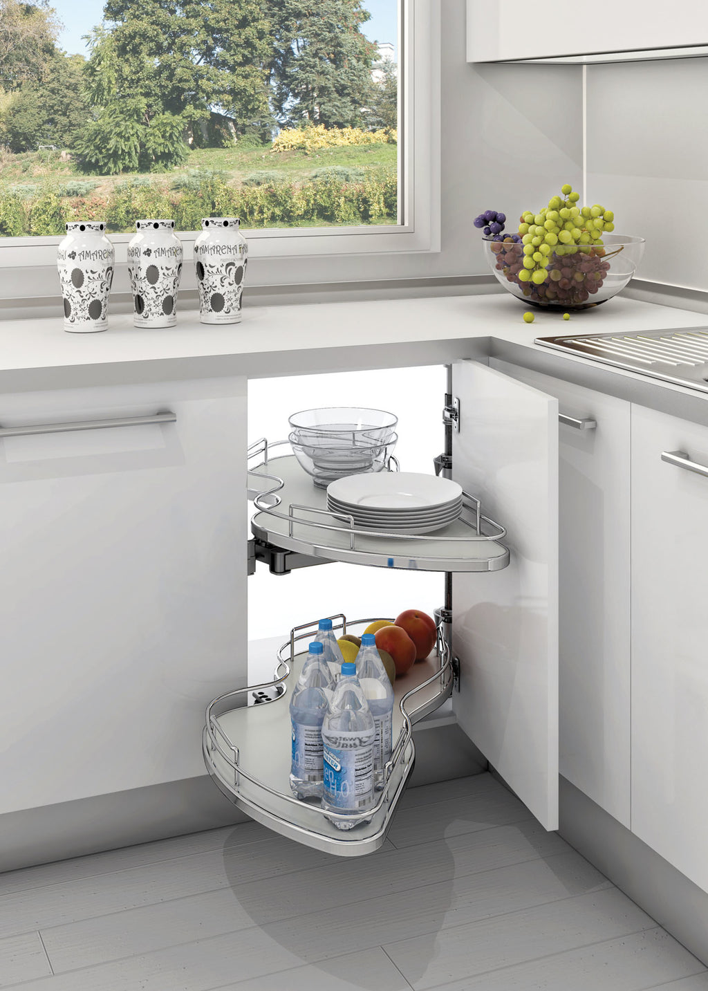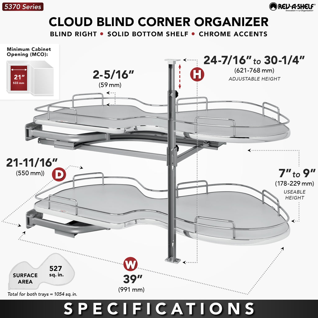 Reach for the stars and fulfill your storage needs with the Cloud Contemporary Blind Corner Organizer. Designed for blind corner cabinets with 15", 18", or 21" cabinet opening, the Cloud is available in multiple colors (Maple, Gray and Orion Gray) to match any kitchen, while adding a pinch of style in the process . Available in both single and two-tier, in either left or right hand options, the Cloud fits into nearly all blind corner applications and is available with or without soft-close.. Included: (2) Cloud Shelves, glide assembly, telescoping mounting post, hardware
