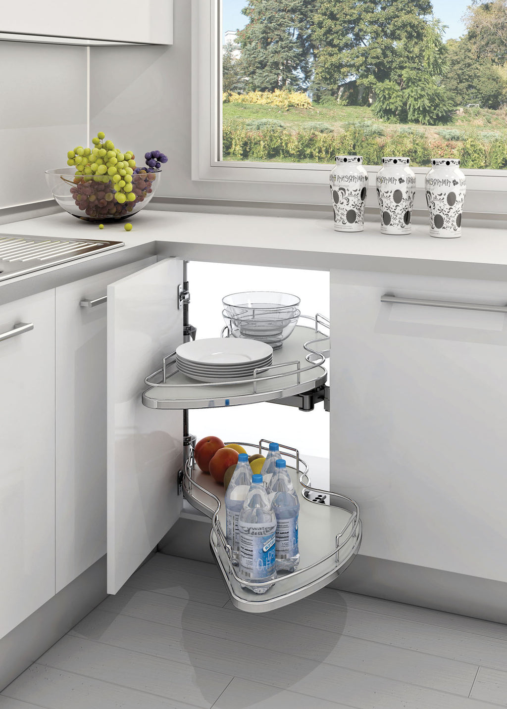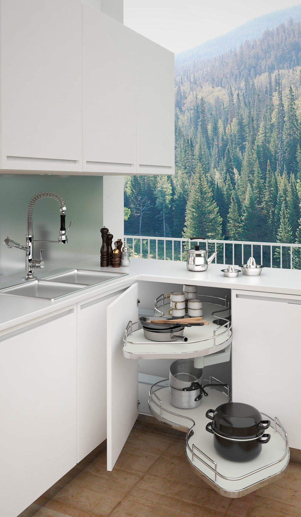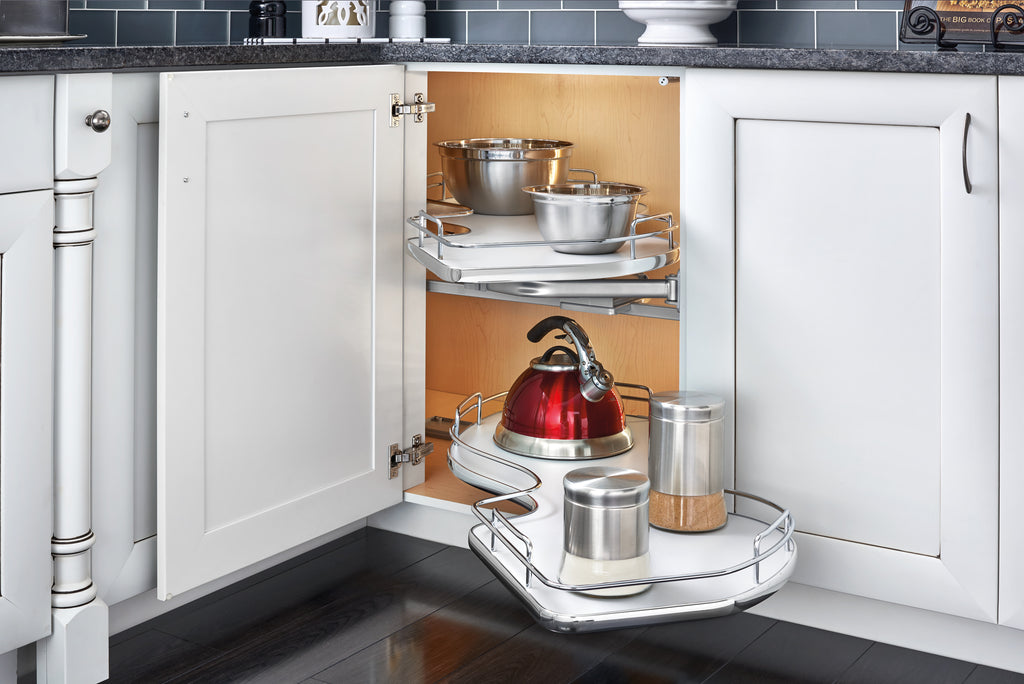Reach for the stars and fulfill your storage needs with the Cloud Contemporary Blind Corner Organizer. Designed for blind corner cabinets with 15", 18", or 21" cabinet opening, the Cloud is available in multiple colors (Maple, Gray and Orion Gray) to match any kitchen, while adding a pinch of style in the process . Available in both single and two-tier, in either left or right hand options, the Cloud fits into nearly all blind corner applications and is available with or without soft-close.. Included: (2) Cloud Shelves, glide assembly, telescoping mounting post, hardware