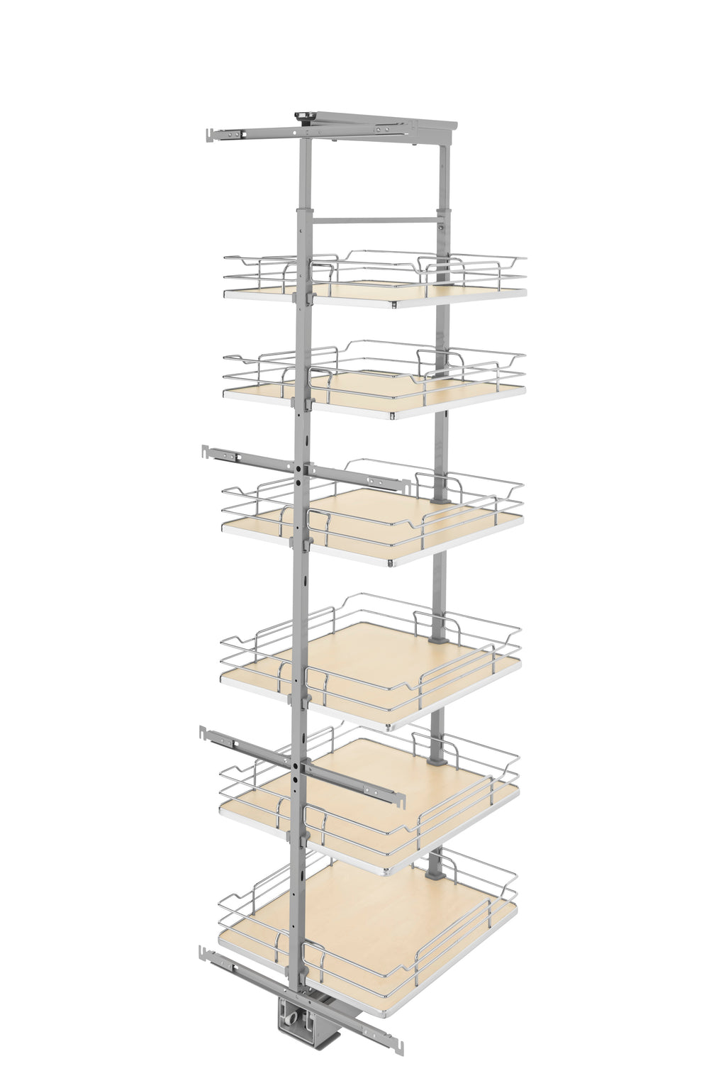 Rev-A-Shelf® 5300 Pullout Pantry Series is the answer to your full access (frameless) cabinetry needs. The series now offers increased basket depths for 24" deep cabinetry and comes in five different widths and four height ranges. Available in a beautiful maple or contemporary gray solid bottom to match every kitchen style, the 5300 Series glides quietly on 250 lb. rated full-extension, soft-close slide system. Features micro-adjustable door-mounting and all kits are packaged with frame, baskets and hardware. Doors are not included.. Included: (6) Maple Solid bottom baskets, (1) Frame, (1) 200 lb. slide system, (2) Door-Mount brackets, hardware