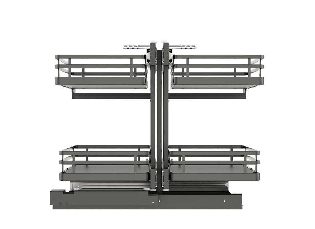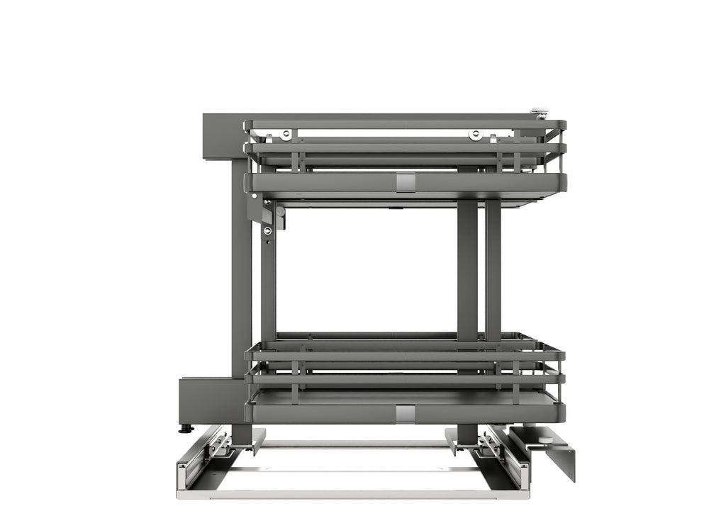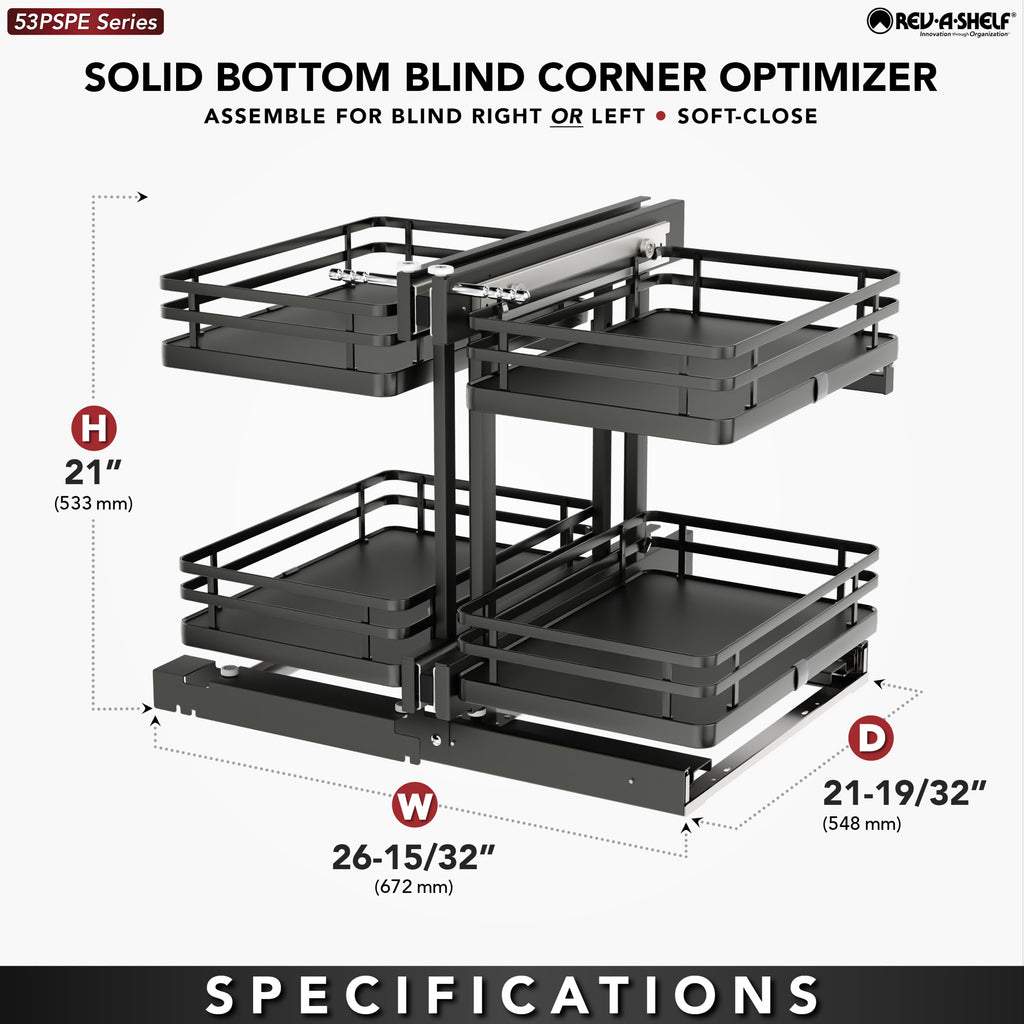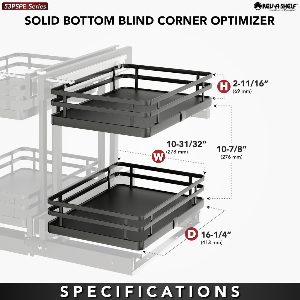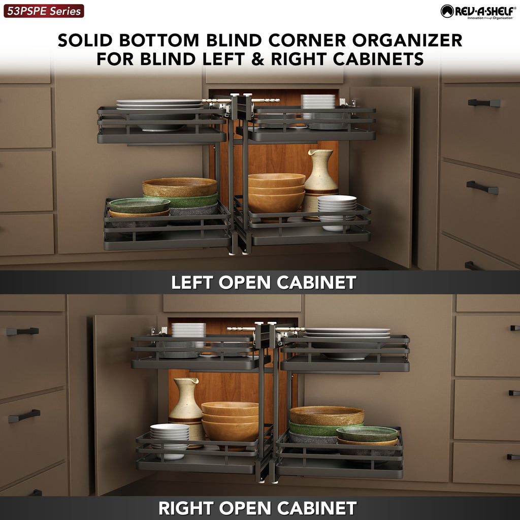 Give your blind corner cabinet an elite upgrade with the 53PSPE Series Elite Blind Corner Optimizer from Rev-A-Shelf®. This innovative solution takes functionality to the next level, featuring upper shelves that slide independently from the lower ones for easy access to every inch of your cabinet. Available in multiple sizes, finishes, and two- or three-tier configurations, this non-handed design ensures a seamless fit in both left- and right-handed applications, making installation a breeze.. Included: (1) Orion Gray blind corner organizer, 4 solid bottom baskets and mounting hardware