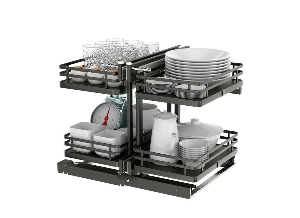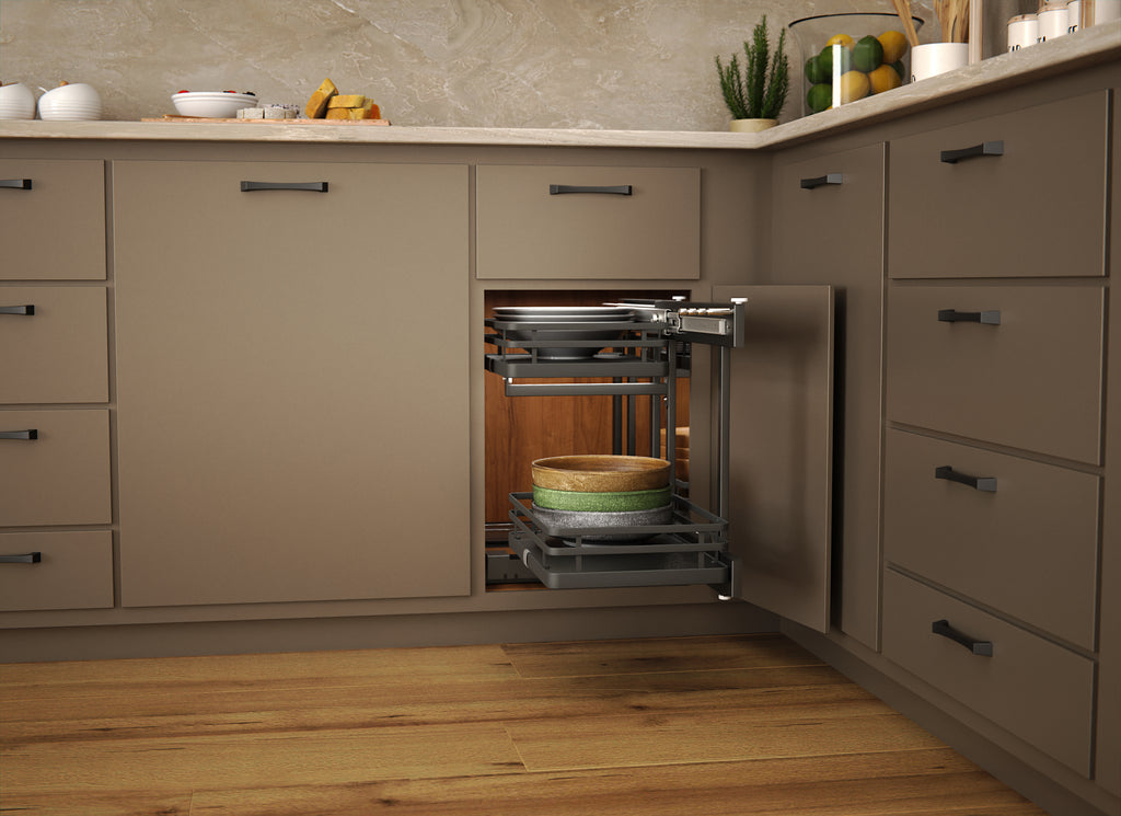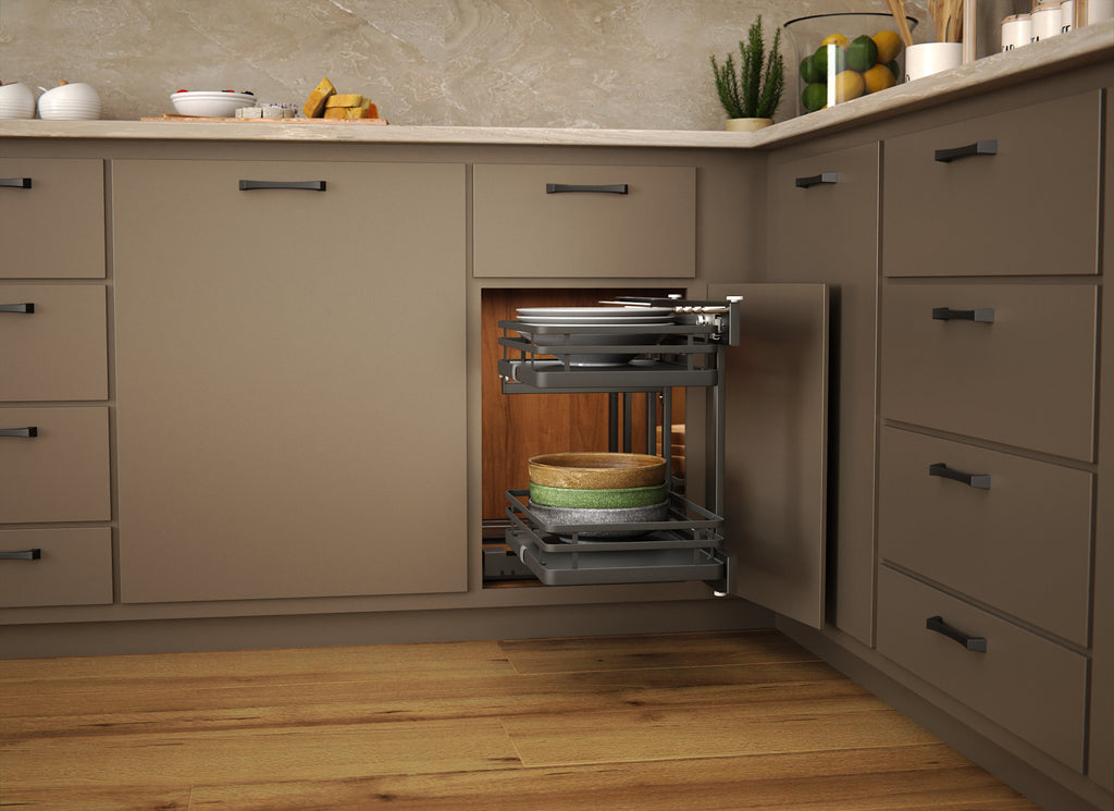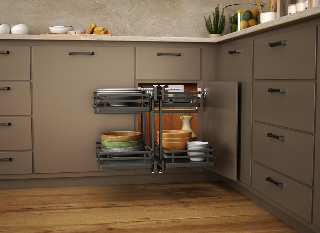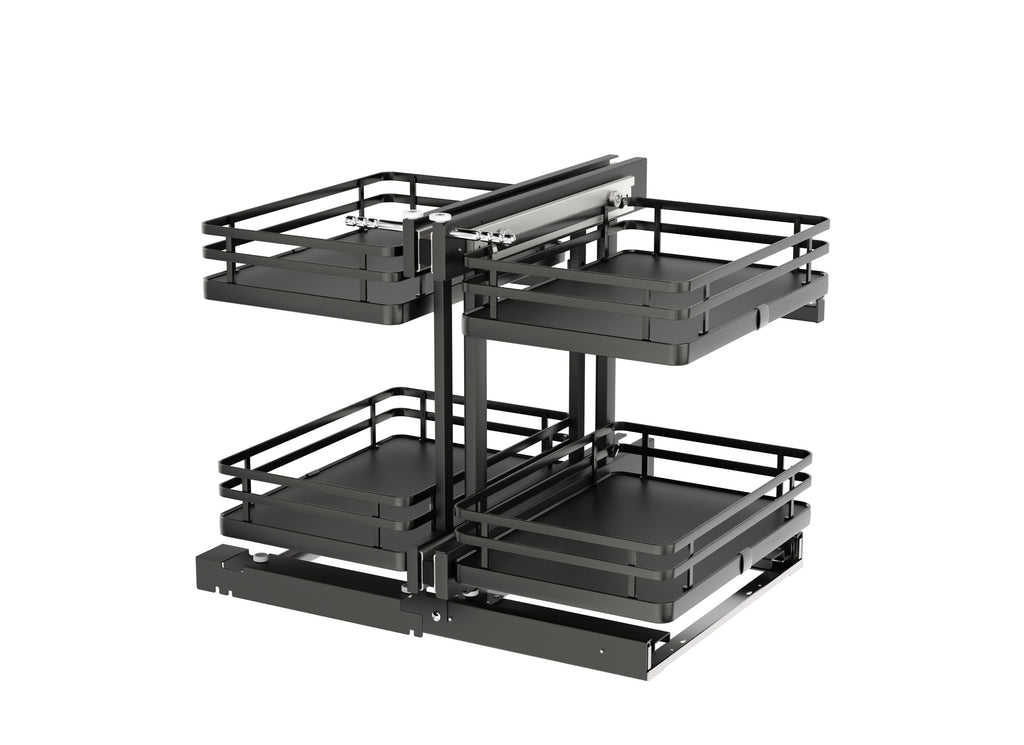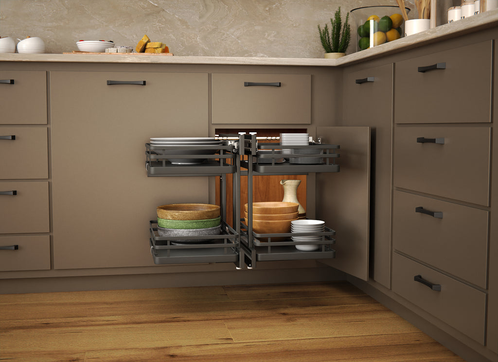 Give your blind corner cabinet an elite upgrade with the 53PSPE Series Elite Blind Corner Optimizer from Rev-A-Shelf®. This innovative solution takes functionality to the next level, featuring upper shelves that slide independently from the lower ones for easy access to every inch of your cabinet. Available in multiple sizes, finishes, and two- or three-tier configurations, this non-handed design ensures a seamless fit in both left- and right-handed applications, making installation a breeze.. Included: (1) Orion Gray blind corner organizer, 4 solid bottom baskets and mounting hardware