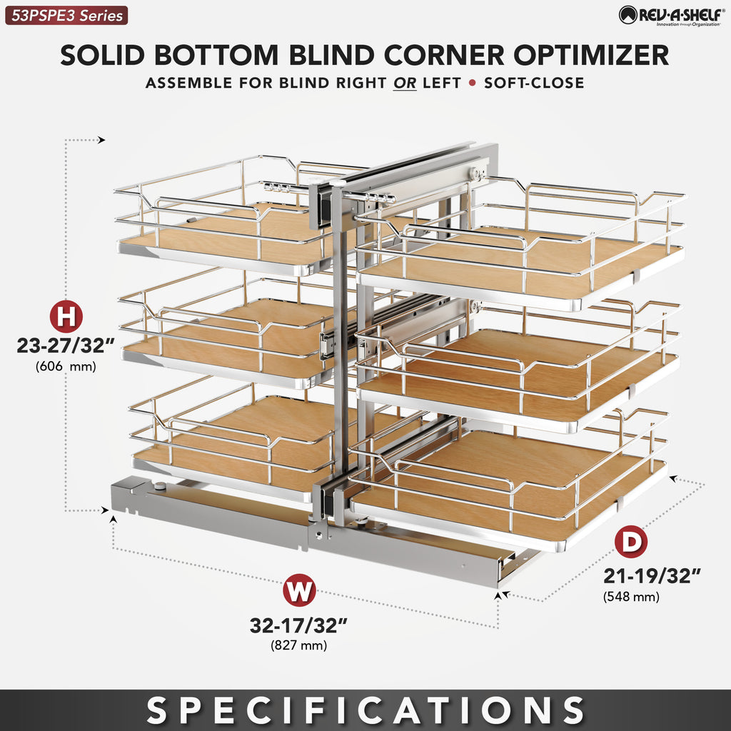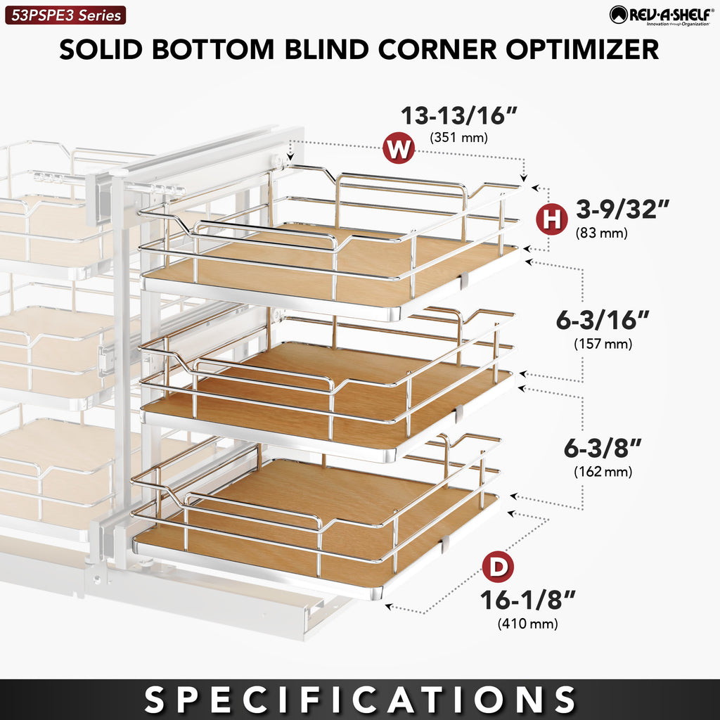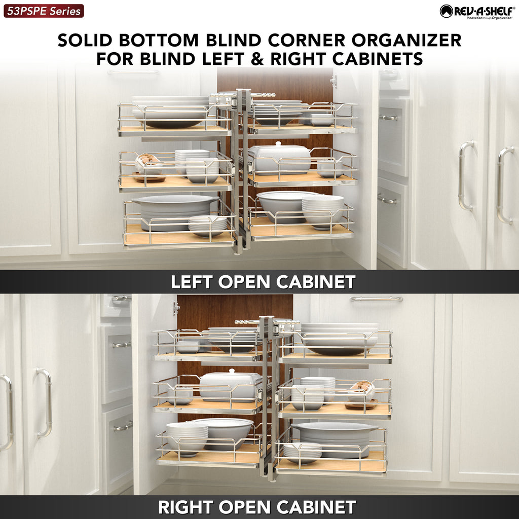 Give your blind corner cabinet an elite upgrade with the 53PSPE Series Elite Blind Corner Optimizer from Rev-A-Shelf®. This innovative solution takes functionality to the next level, featuring upper shelves that slide independently from the lower ones for easy access to every inch of your cabinet. Available in multiple sizes, finishes, and two- or three-tier configurations, this non-handed design ensures a seamless fit in both left- and right-handed applications, making installation a breeze.. Included: (1) Slide system, (1) frame, (6) baskets, Hardware