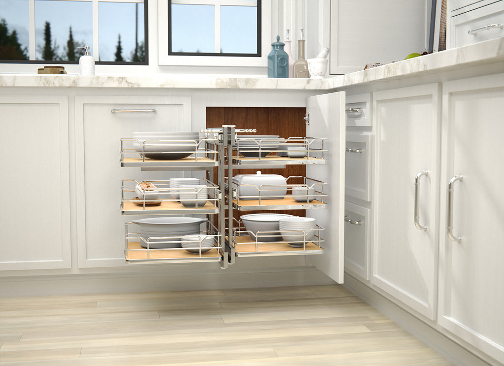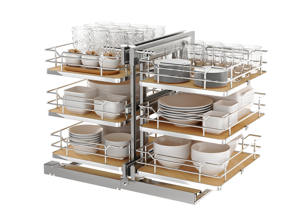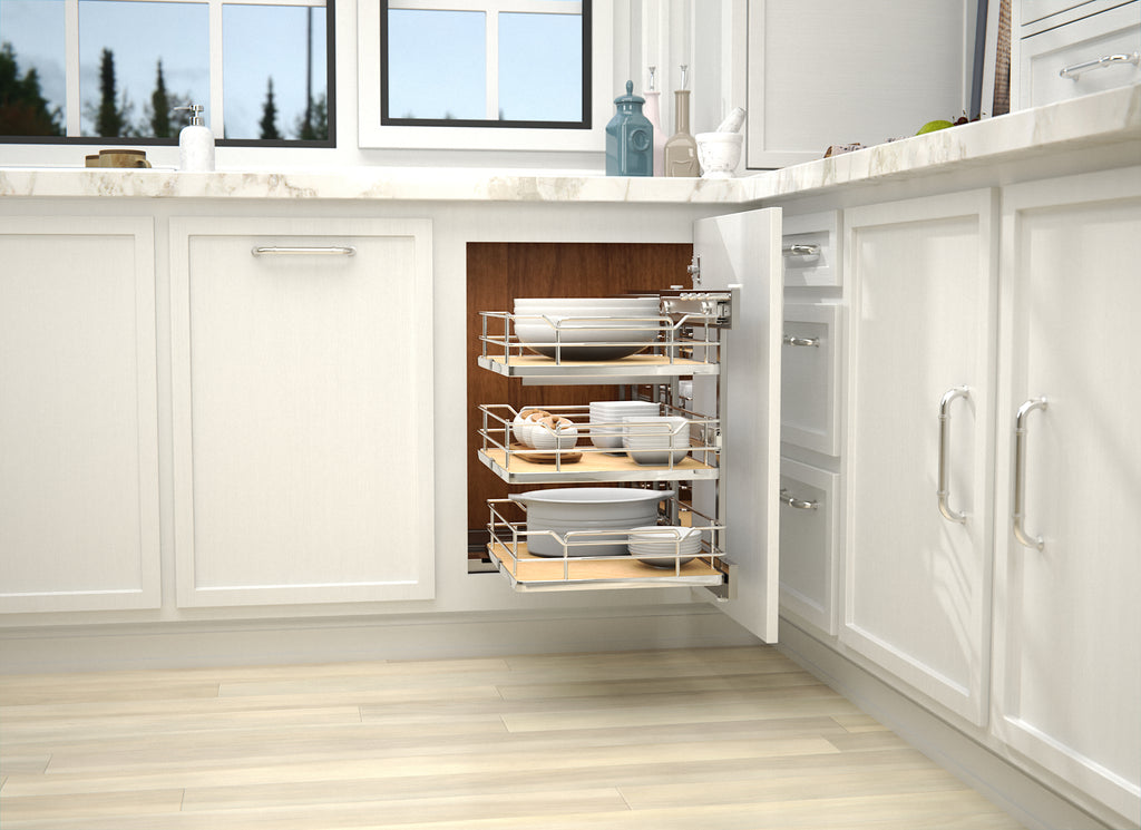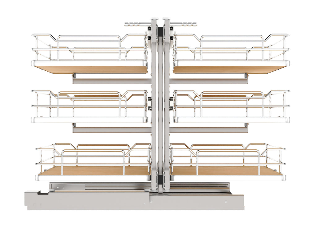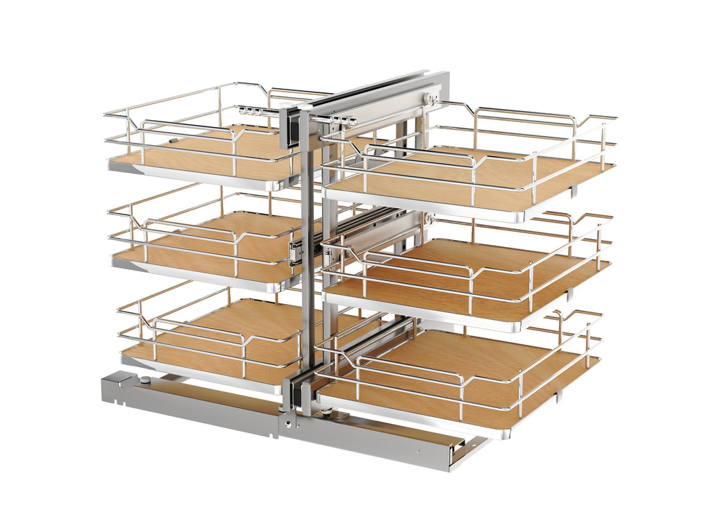 Give your blind corner cabinet an elite upgrade with the 53PSPE Series Elite Blind Corner Optimizer from Rev-A-Shelf®. This innovative solution takes functionality to the next level, featuring upper shelves that slide independently from the lower ones for easy access to every inch of your cabinet. Available in multiple sizes, finishes, and two- or three-tier configurations, this non-handed design ensures a seamless fit in both left- and right-handed applications, making installation a breeze.. Included: (1) Slide system, (1) frame, (6) baskets, Hardware