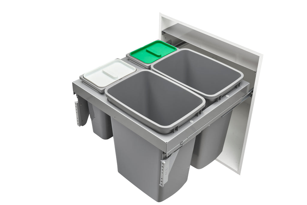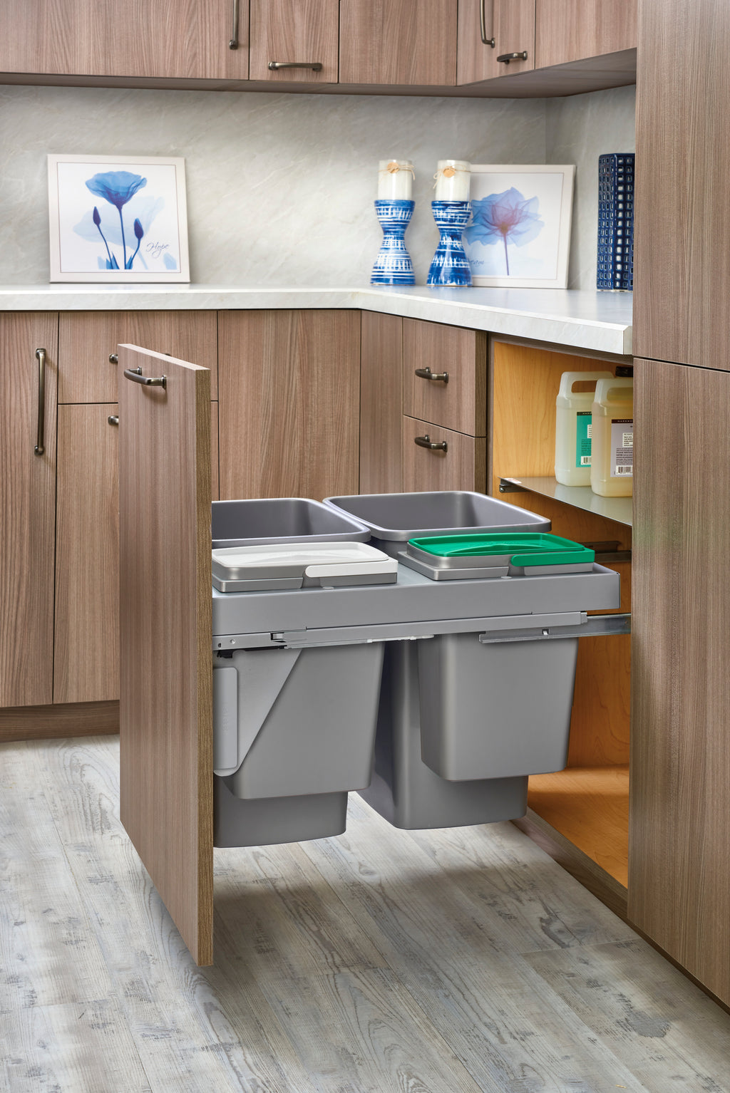The Rev-A-Shelf® 53TM Series Built-in Waste Container was crafted with convenience and style in mind. Designed for full access (frameless) 18" and 24" full-height base cabinets for both 5/8" and 3/4" side walls, the series includes multiple waste container configurations and sizes with a sleek metal lid. Units feature 90 lb. rated, 1-1/2" over-travel grass slides, and a sturdy door-mountable frame.. Included: (2) Silver 35 qt. waste containers, (2) 8 qt. waste containers, (1) metal frame, (1) pair of slides, mounting hardware, and Door-Mount brackets