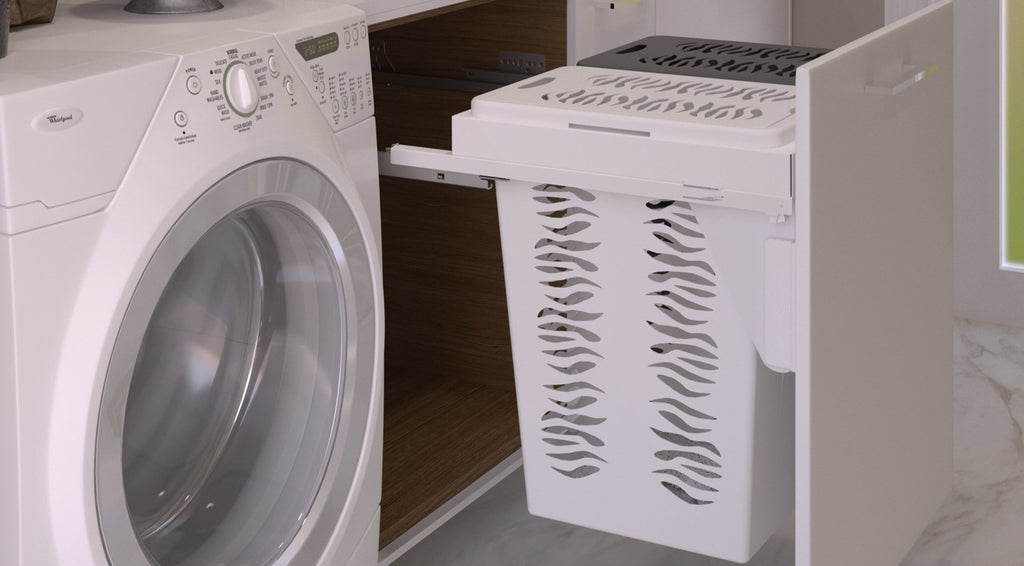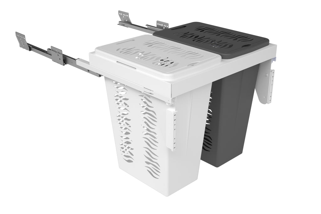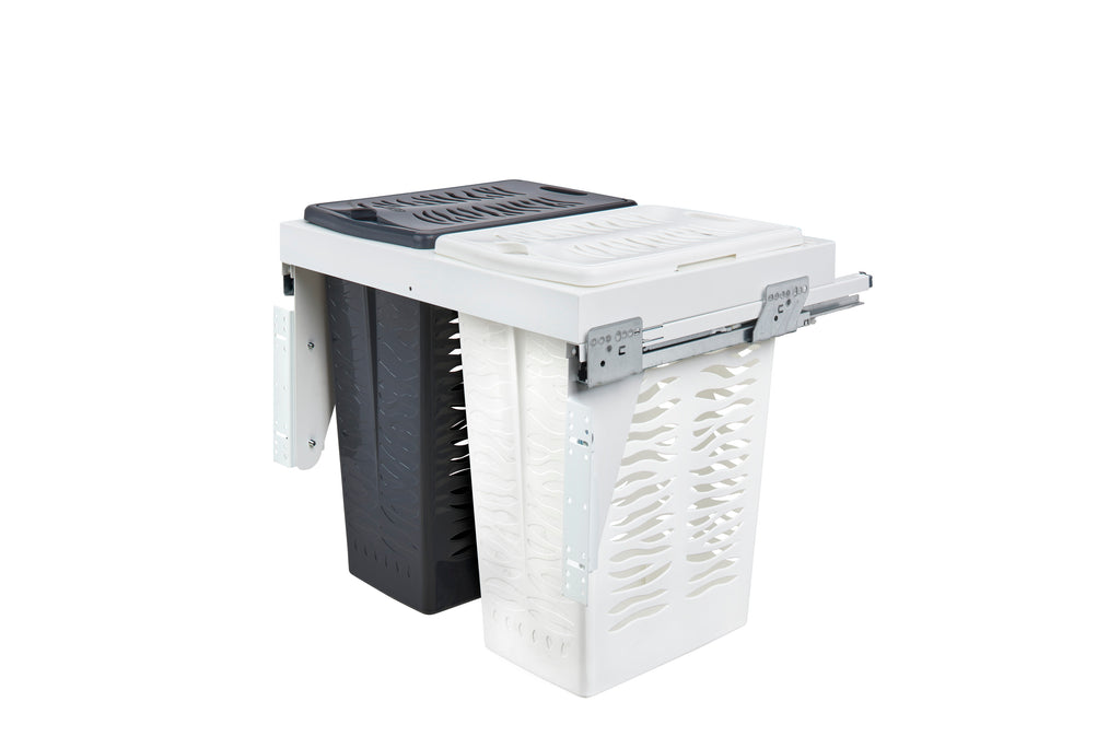 The Rev-A-Shelf® 53TMVH Series is crafted with convenience and style in mind. Designed for full access 24" vanity base cabinets with 5/8" or 3/4" sidewalls. The 53TMVH Series metal frame holds one white and one gray .85 BU hampers. This sleek accessory features full-extension 90 lb. rated undermount slides with soft-close and a pre-assembled door-mount brackets.. Included: (2) Polymer hamper bins with lids, (1) metal frame, (1) pair of slides, mounting hardware, and Door-Mount brackets