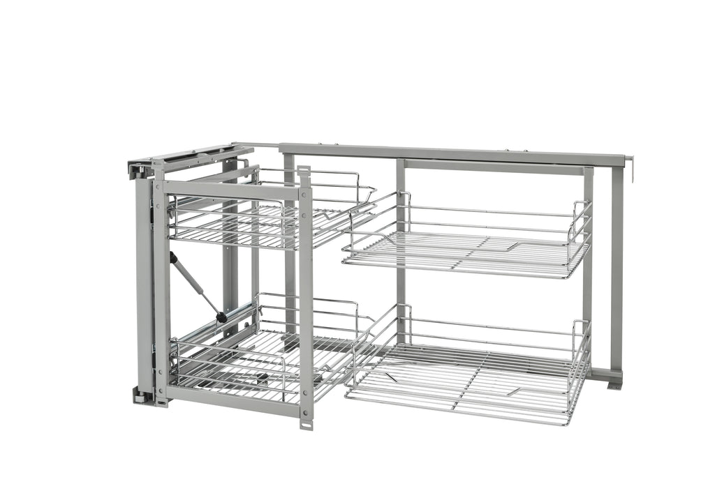 Blind corners brim with storage opportunities thanks to the state-of-the-art 5707 Series. Available for 15" and 18" cabinet openings. Two large and two small chrome-plated baskets accommodate a variety of items, and dynamic pivot sliding hardware provides easy access to areas once deemed unusable.. Included: (1) Frame, (2) large and (2) small baskets and mounting hardware