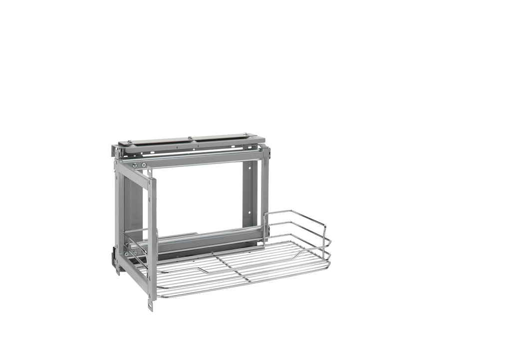 Above your refrigerator or oven is one of the hardest places to reach in the back of that cabinet. Well Rev-A-Shelf® has fixed this by designing an above the appliance organizer. This unit requires a 24" deep cabinet, but will bring the hard-to-reach items to your finger tips.. Included: (1) Chrome Basket, mounting frame and hardware necessary for installation