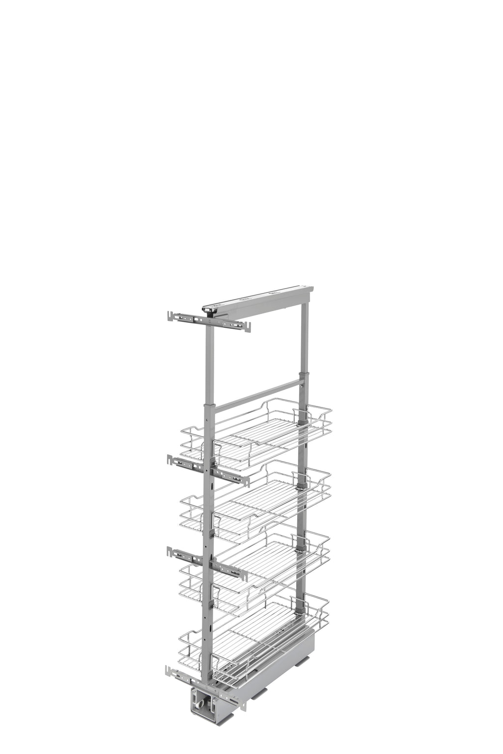 Enhance functionality and preserve a stylish image with the Rev-A-Shelf® Chrome Pullout Pantry. The 5700 CR Series is available in a plentiful selection of sizes and is designed on the 250 lb. rated slide system for a quiet glide out function. This accessory features micro-adjustment door-mounting brackets and top and bottom slide covers for a finished look. The chrome pullout pantries are kit packaged with frame, baskets and door-mounting brackets in one carton.. Included: (1) Chrome pantry with (4) baskets and mounting hardware