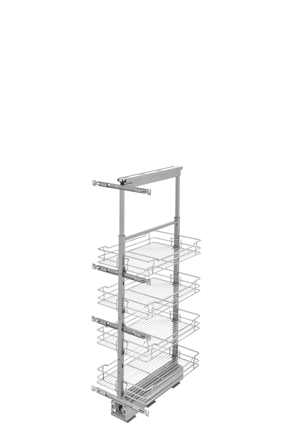 Enhance functionality and preserve a stylish image with the Rev-A-Shelf® Chrome Pullout Pantry. The 5700 CR Series is available in a plentiful selection of sizes and is designed on the 250 lb. rated slide system for a quiet glide out function. This accessory features micro-adjustment door-mounting brackets and top and bottom slide covers for a finished look. The chrome pullout pantries are kit packaged with frame, baskets and door-mounting brackets in one carton.. Included: (1) Chrome pantry with (4) baskets and mounting hardware