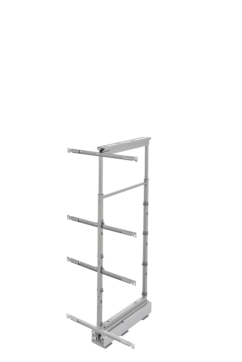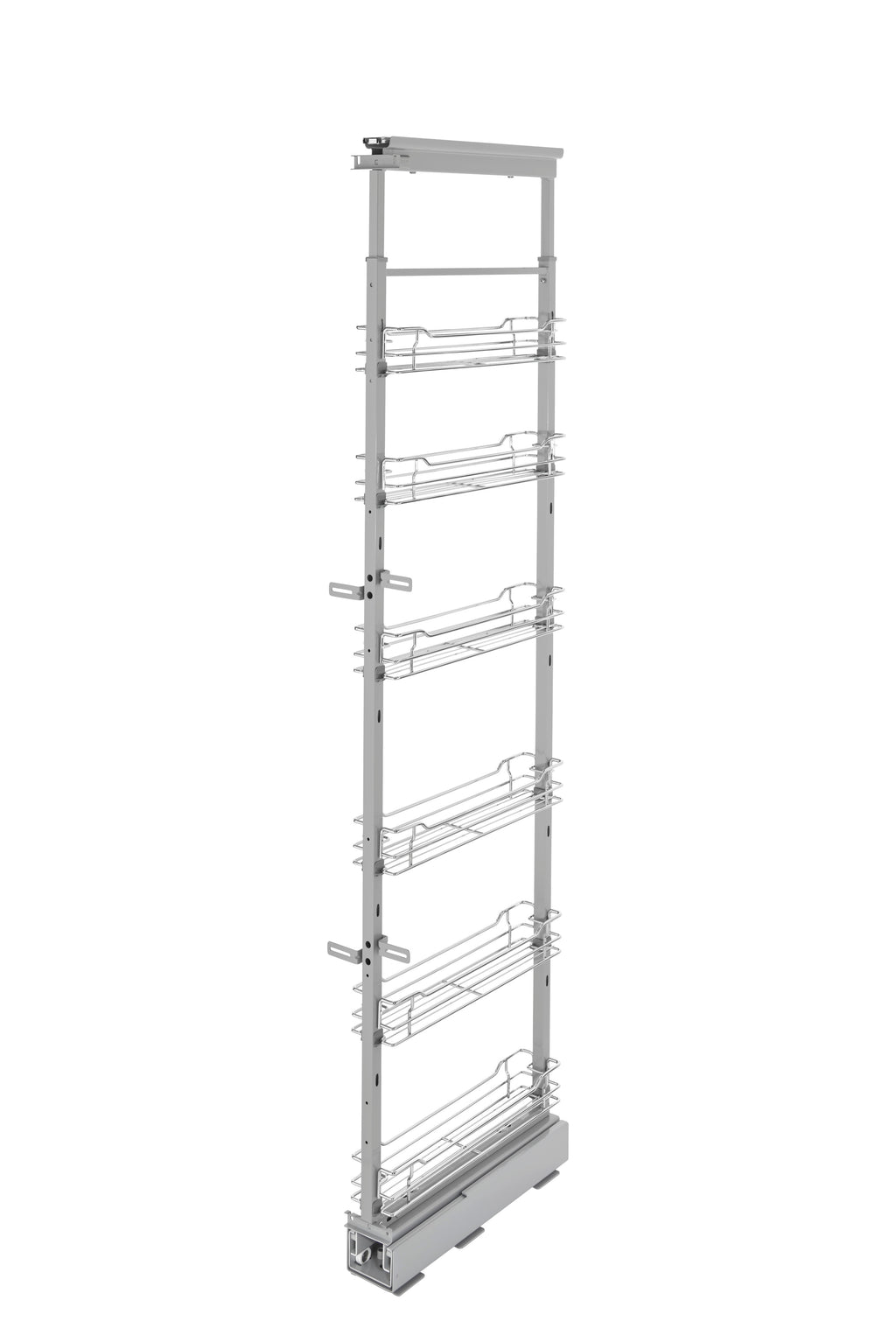 Enhance functionality and preserve a stylish image with the Rev-A-Shelf® Chrome Pullout Pantry. The 5700 CR Series is available in a plentiful selection of sizes and is designed on the 250 lb. rated slide system for a quiet glide out function. This accessory features micro-adjustment door-mounting brackets and top and bottom slide covers for a finished look. The chrome pullout pantries are kit packaged with frame, baskets and door-mounting brackets in one carton.. Included: (1) Chrome pantry with (6) baskets and mounting hardware