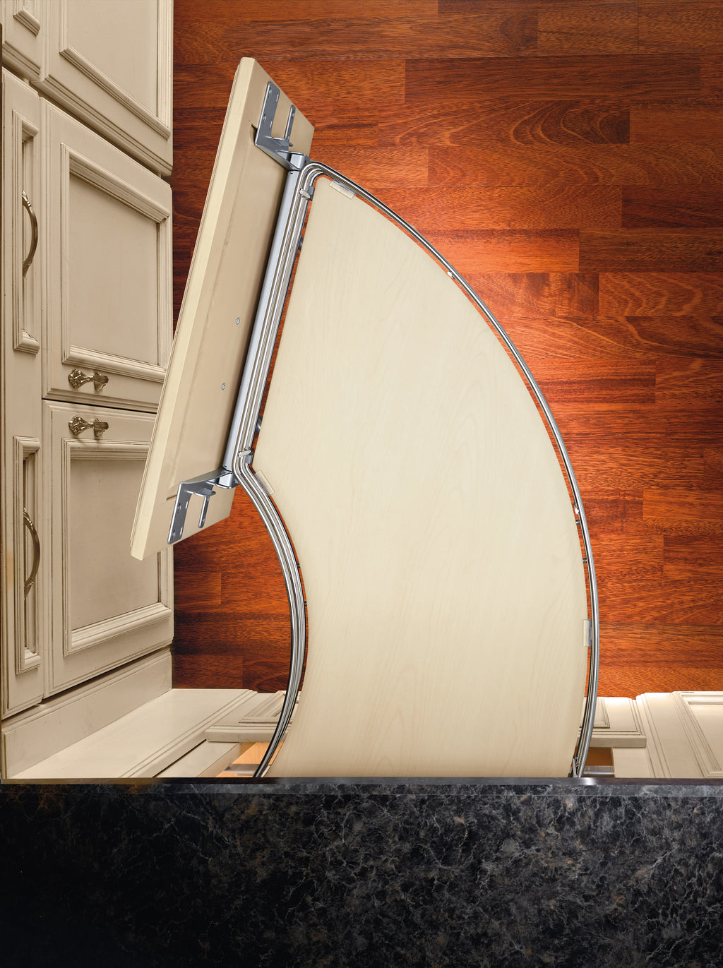 "The Curve" takes luxury blind corner storage to the next level. The individual shelves provide complete access and up to 775 sq. inches of surface area for storage. The Curve is unique in that it will work in either a full-height, door drawer or double door application. Door-mount brackets are included as a option to mount your door or not.. Included: (1) Frame, (1) Top Shelf, (1) Bottom Shelf, (2) Door-Mount brackets and mounting hardware