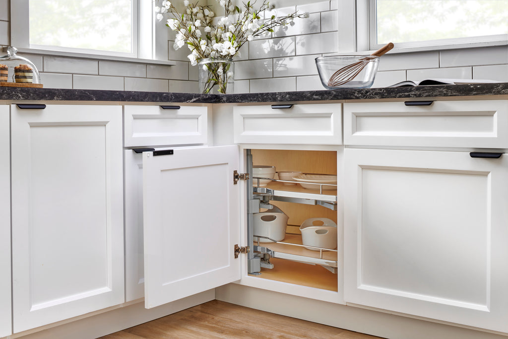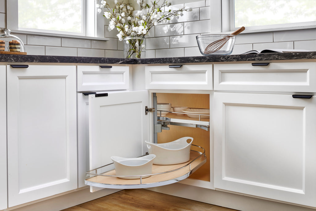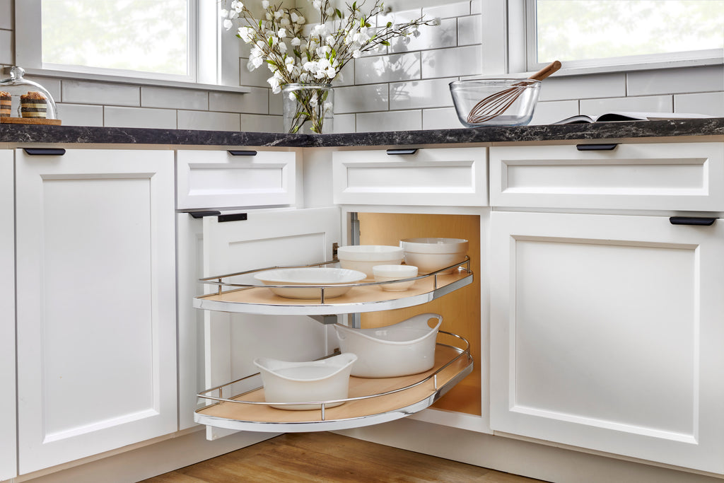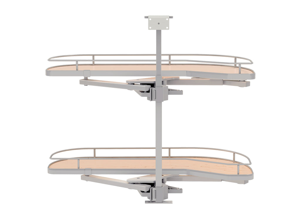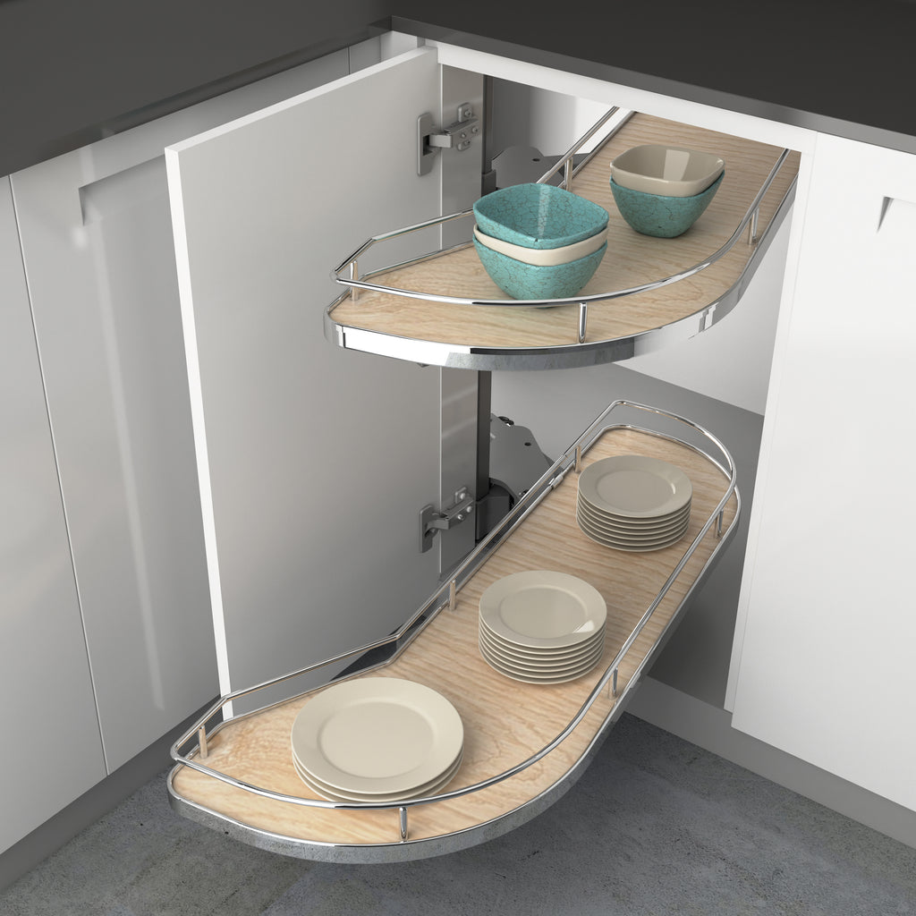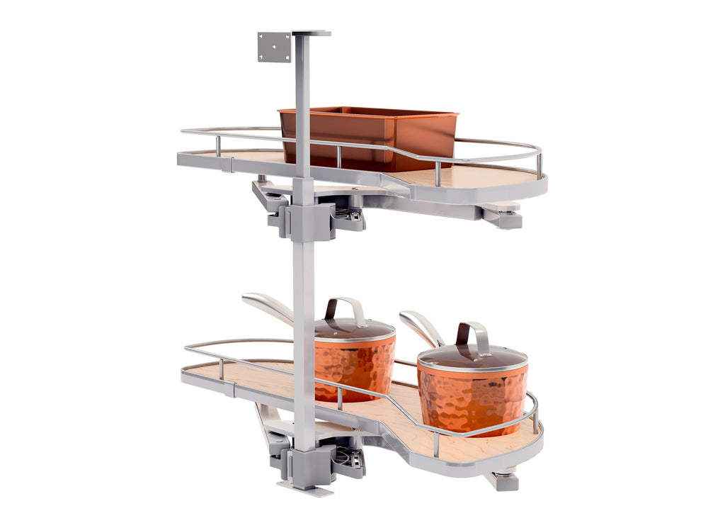 The 587 Series “Girasolo” Blind Corner Optimizer by Rev-A-Shelf® makes organizing your blind corner cabinet smooth sailing. This unique design features one or two pullout trays that easily glide directly out on an innovative soft-close pivot hardware system, eliminating the need for adjacent appliance clearance. The unique shelving system also allows for maximum storage capacity, while optimizing the usage of the hard-to-reach storage area.. Included: (2) Right Girasolo maple solid bottom/chrome trays, post mechanism and mounting hardware