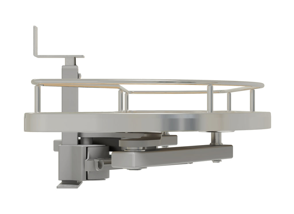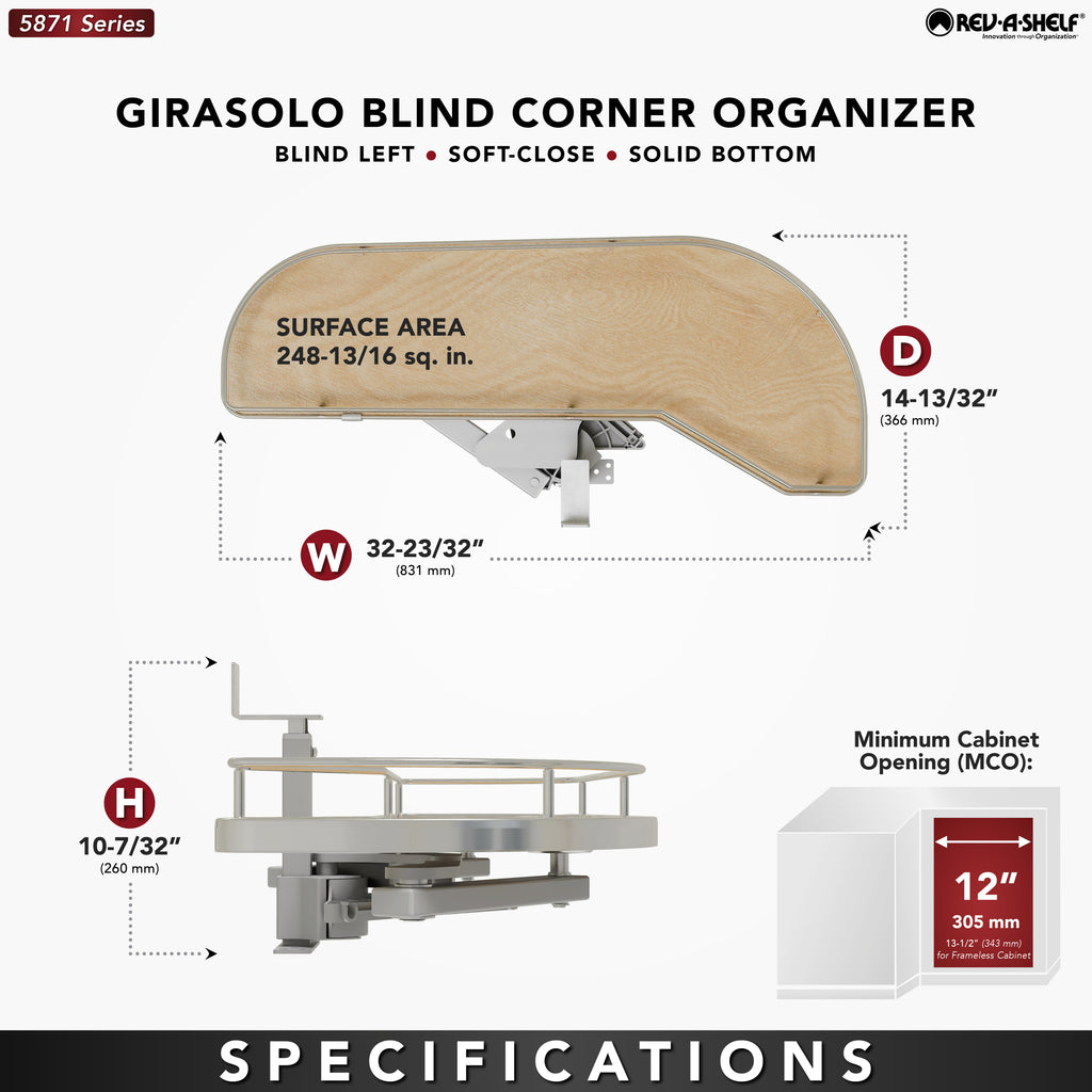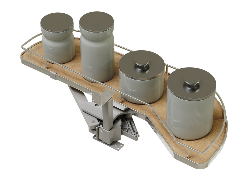 The 587 Series “Girasolo” Blind Corner Optimizer by Rev-A-Shelf® makes organizing your blind corner cabinet smooth sailing. This unique design features one or two pullout trays that easily glide directly out on an innovative soft-close pivot hardware system, eliminating the need for adjacent appliance clearance. The unique shelving system also allows for maximum storage capacity, while optimizing the usage of the hard-to-reach storage area.. Included: (1) Girasolo tray, post mechanism, and mounting hardware