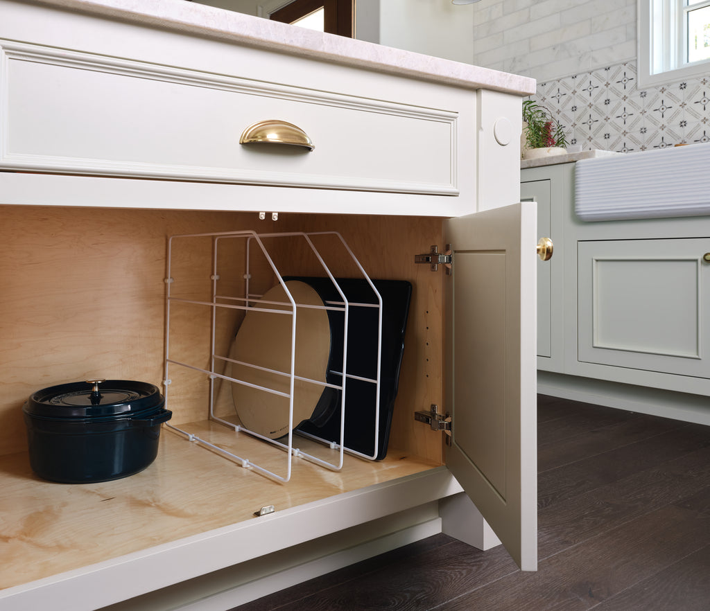 Simple but effective. Why fight with your baking sheets or platters and just organize them. Perfect for those small cabinets either above your refrigerator or the skinny cabinets next to your oven. Use both dividers in a large cabinet or use them individually for multiple cabinets.. Included: (1) White organizer with mounting hardware