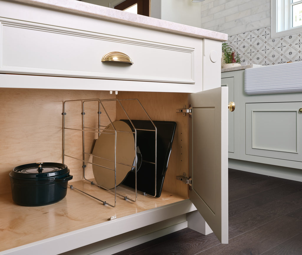 Simple but effective. Why fight with your baking sheets or platters and just organize them. Perfect for those small cabinets either above your refrigerator or the skinny cabinets next to your oven. Use both dividers in a large cabinet or use them individually for multiple cabinets.. Included: (1) Chrome organizer with mounting hardware