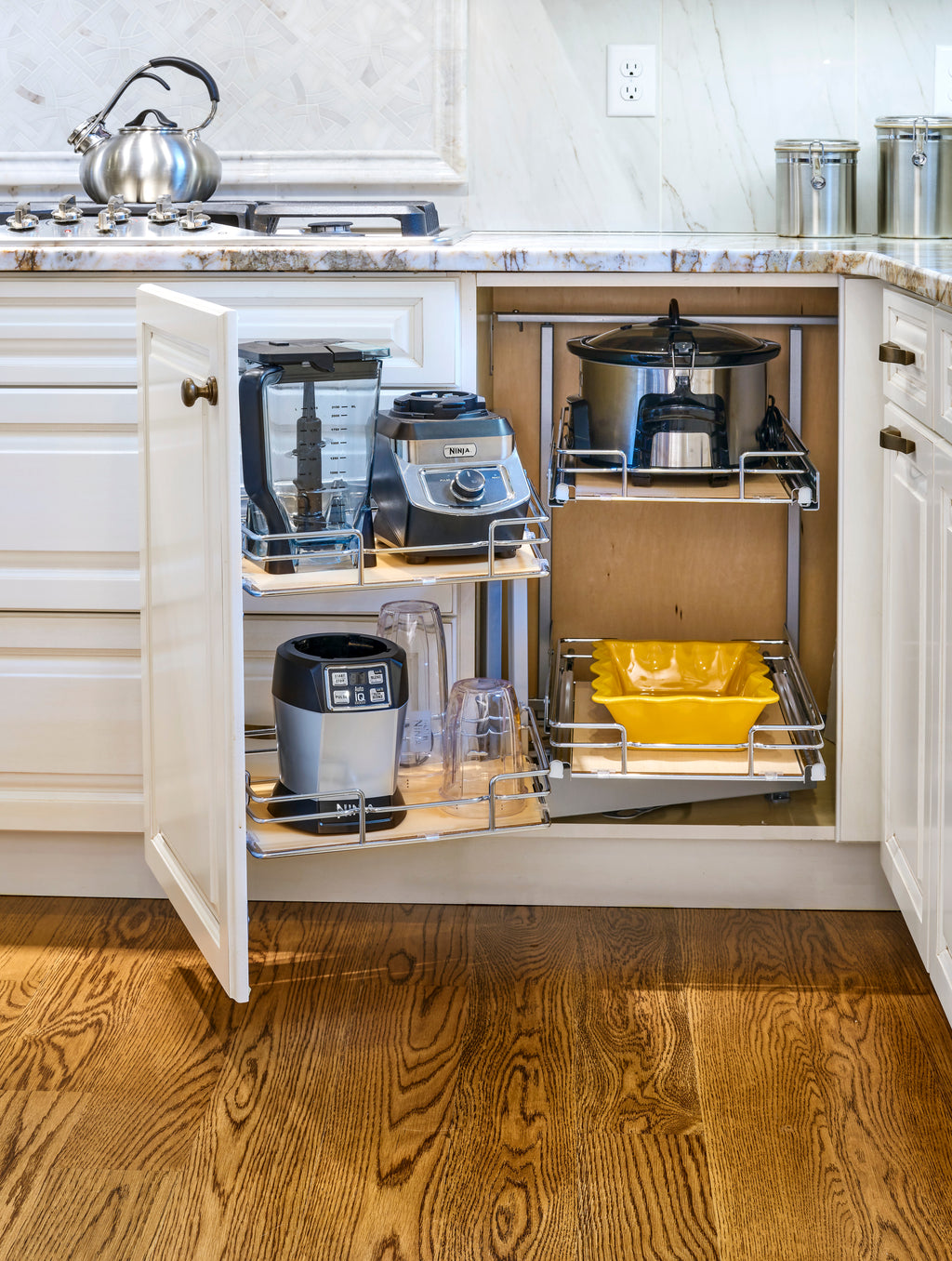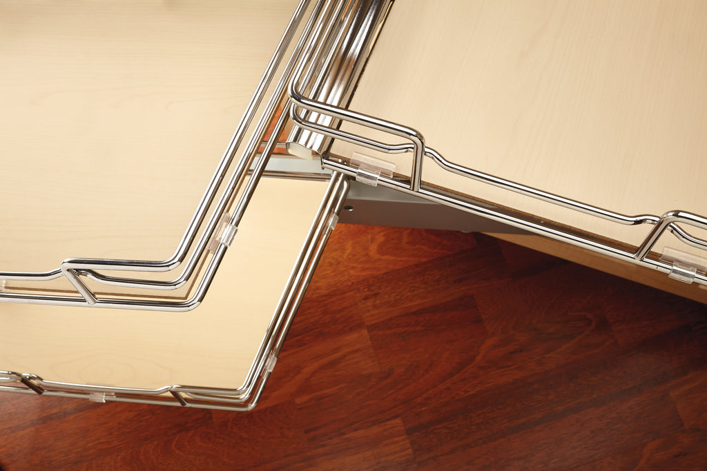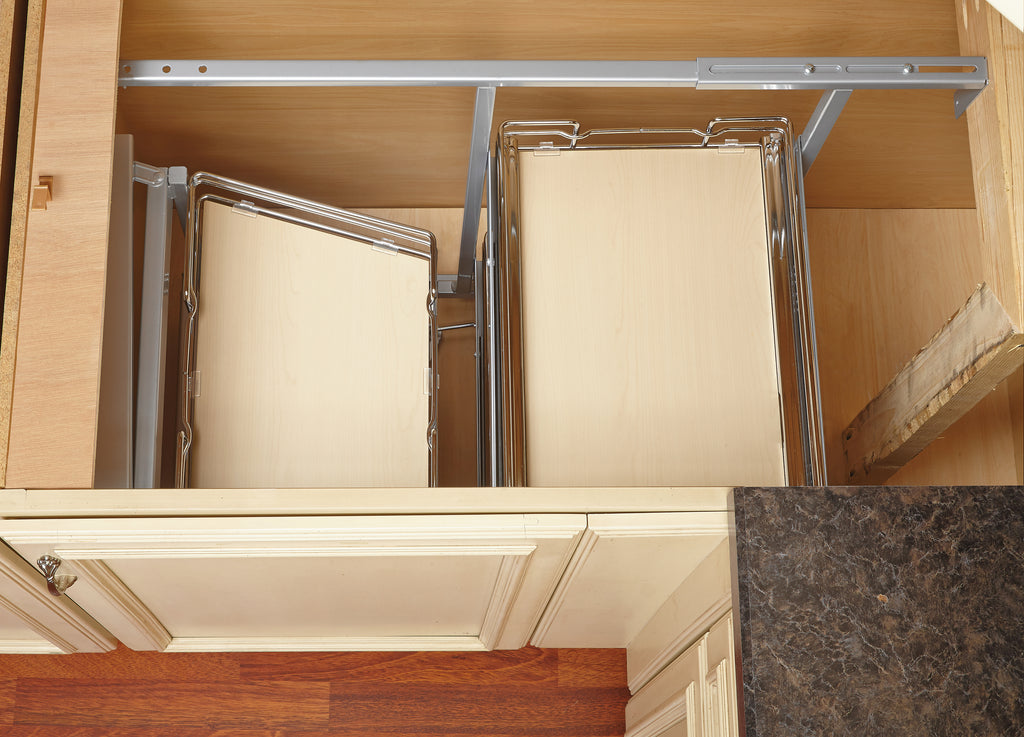 Optimize your storage with this luxurious blind corner organizer. As you pull open the cabinet door the front baskets slide & rotate out of the cabinet while the rear baskets move into sight. Each rear basket can then be independently pulled open allowing full access to those hard to reach items.. Included: (1) Frame, (2) large and (2) small baskets and mounting hardware