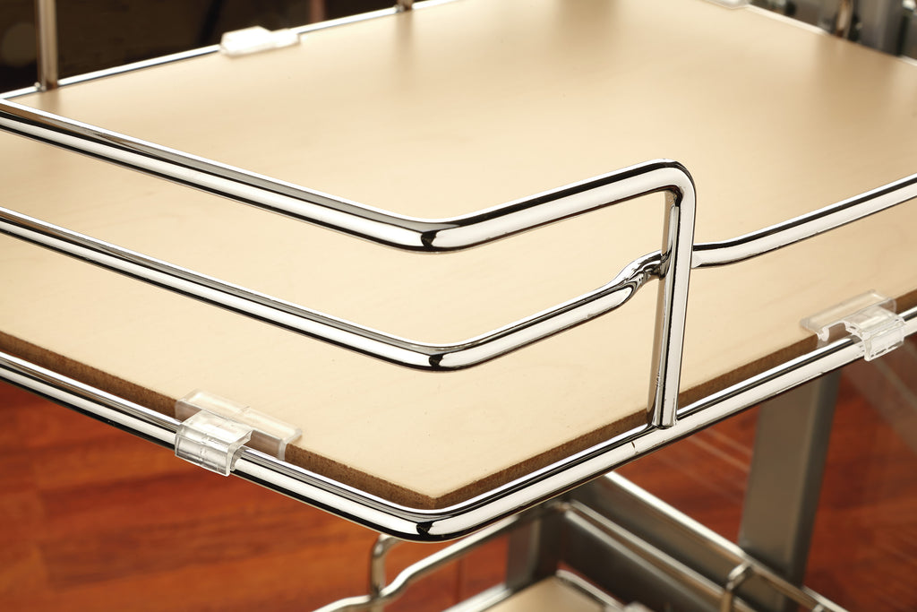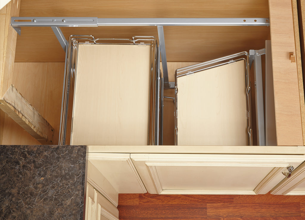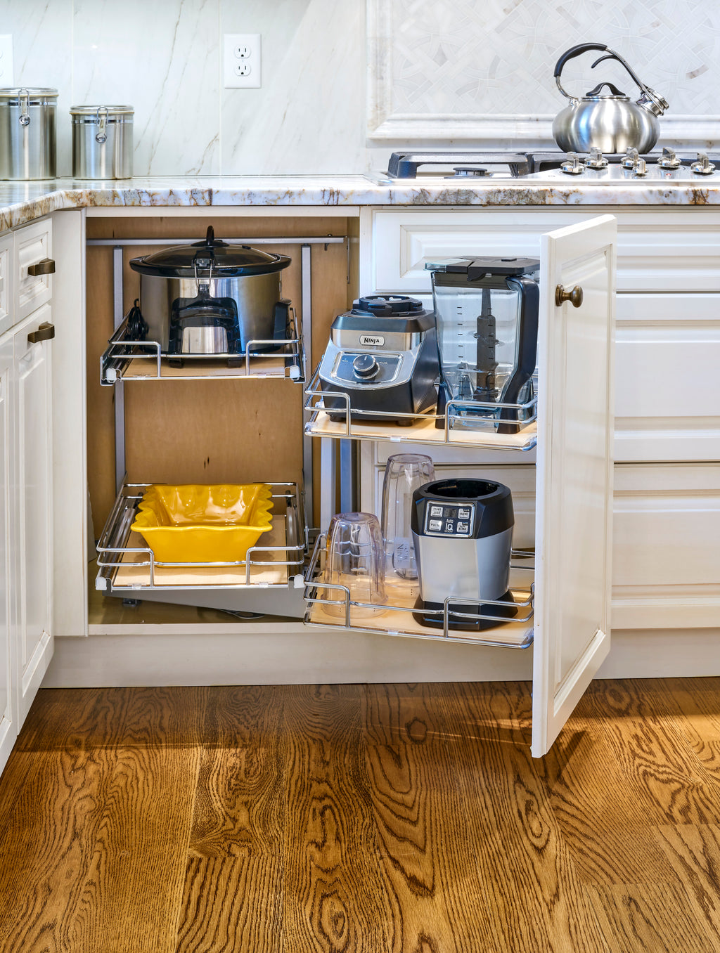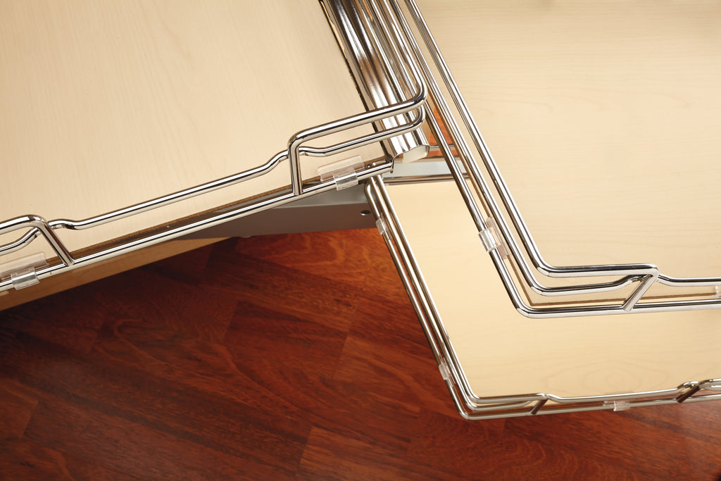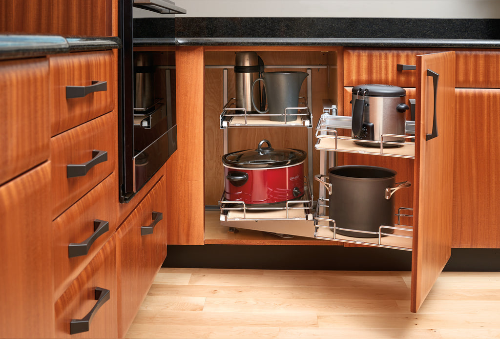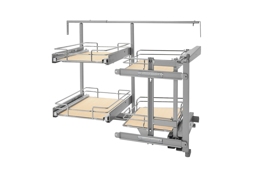 Optimize your storage with this luxurious blind corner organizer. As you pull open the cabinet door the front baskets slide & rotate out of the cabinet while the rear baskets move into sight. Each rear basket can then be independently pulled open allowing full access to those hard to reach items.. Included: (1) Frame, (2) large and (2) small baskets and mounting hardware
