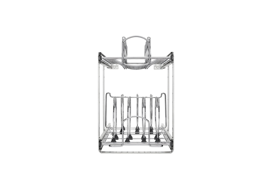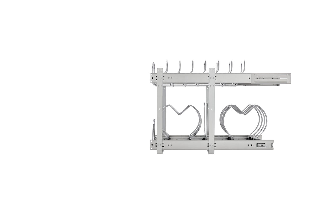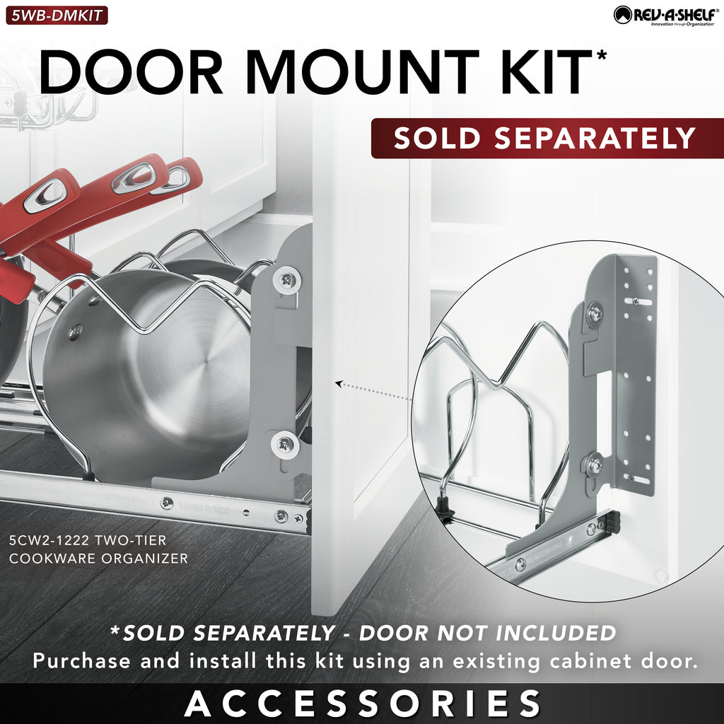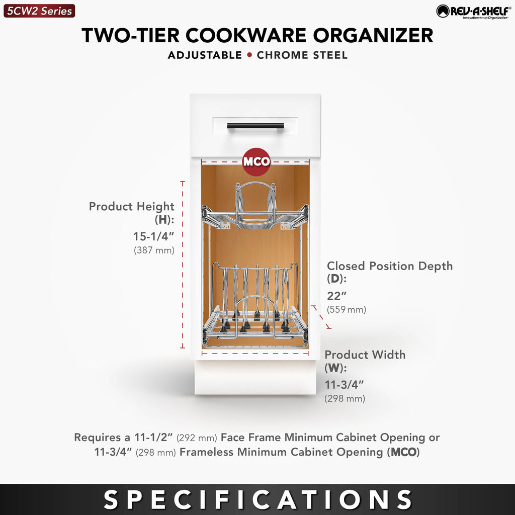 Revolutionize the way you store your pots, pans, and lids with the Rev-A-Shelf® Two-Tier Cookware Organizer. The 5CW2 features independently operating shelves that accommodate a variety of cookware sizes and brands. The top tier organizes lids and the bottom tier features adjustable dividers to store a variety of larger pots and pans. Made with a heavy-duty chrome-plated wire frame and 100 lb. rated full-extension ball-bearing slides. The bottom, side, and rear mounting provide you the sturdiness you expect and easy installation. Optional door-mounting kit available with the 5WB-DMKIT.. Included: (1) Chrome Two-Tier cookware organizer, dividers and mounting hardware